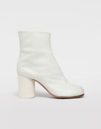 The iconic Maison Margiela split-toe Tabi boot in calfskin leather. 8 cm cylindrical heel. Hook closures on the back. Leather soles. Made in Italy. Item details 100% Bovine leather Basic solid colour Hook-and-eye closure Leather sole