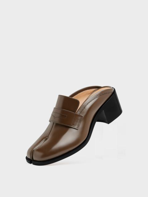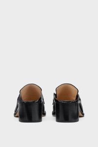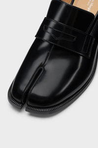 Crafted in polished calfskin for a sleek finish, these mules reinterpret the classic penny loafer – a staple of British city dressing – as a refined slip-on silhouette. They feature the Tabi split-toe, inspired by the traditional 15th century Japanese sock bearing the same name – launched for the Maison's debut collection in 1989. It captures the avant-garde and insubordinate spirit of the Maison and exists as a heritage classic, continually explored through each collection. Maison Margiela's signature single white stitch appears at the back. Product Details Item ID S58WP0289PS679T8013 Upper: 100% Calf Leather Lining: 100% Ovine Leather Inside: 100% Ovine Leather Contrast: 100% Calf Leather Sole: 100% Calf Leather Contrast: 100% Rubber Tabi penny loafer mules in calf leather Stacked Cuban heel Maison Margiela signature to the insole Made in Italy