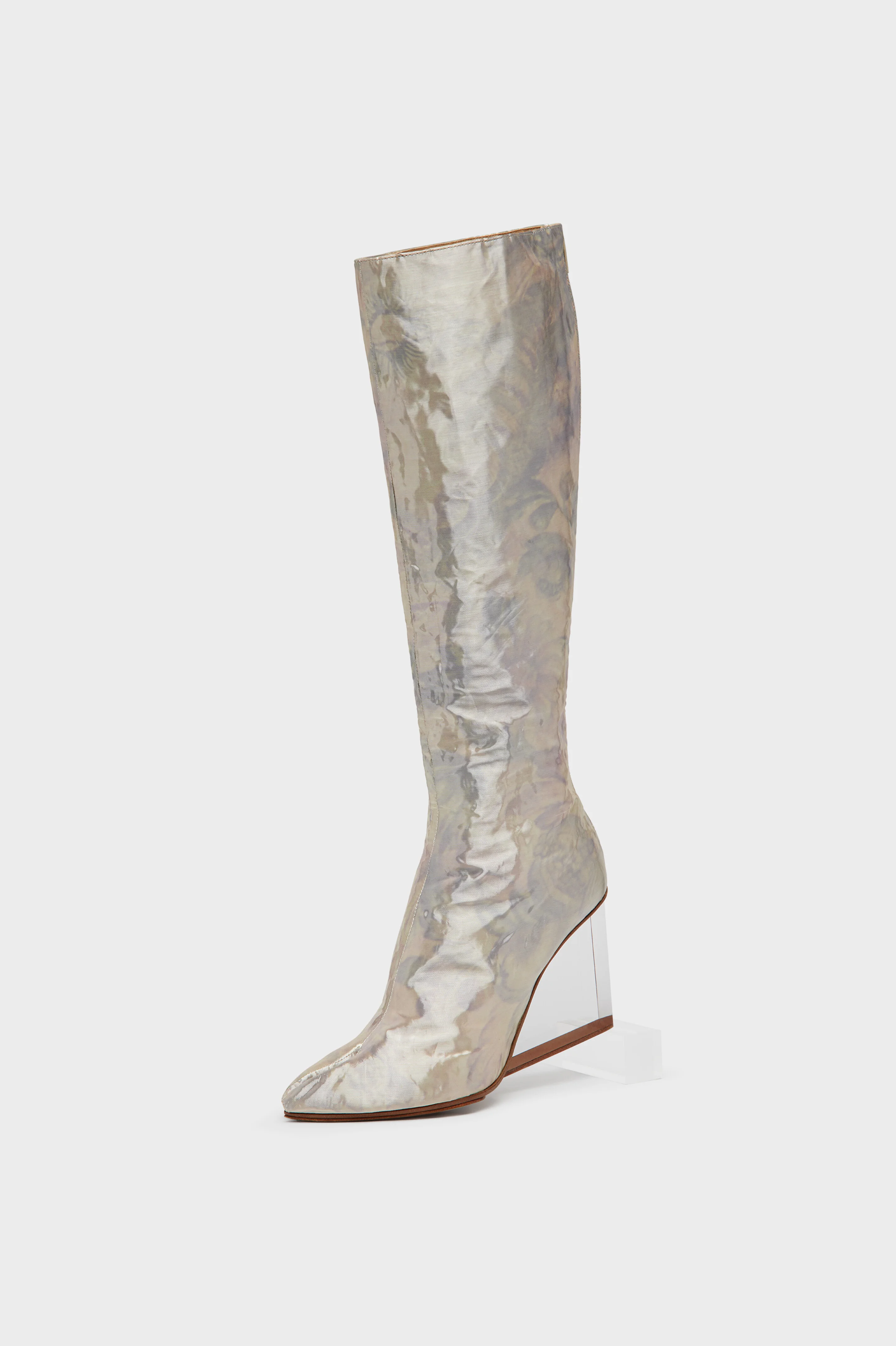 The Plexi Claw High Boots reinterpret a Maison Margiela archival design through material illusion and sculptural tension. The fabric developed for our Artisanal couture collection, made from printed computer wires, they merge two Maison Margiela icons: the Tabi split-toe and the Plexi heel. At the back, the Maison’s single white stitch marks its signature. Product Details Item ID S39WW0077P7701T9002 Upper: 91% metal 9% polyester Lining: 100% ovine leather Inside: 100% ovine leather Sole: 100% calf leather Tabi split toe Geometric heel Back zip closure Made in Italy