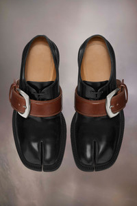 The Derby shoes come in brushed calf leather with a cleated sole and laces. They are designed with a detachable, adjustable contrast strap with large buckle. The pair feature the Tabi split-toe, inspired by the traditional 15th century Japanese sock bearing the same name – launched for the Maison's debut collection in 1989. It captures the avant-garde and insubordinate spirit of the Maison and exists as a heritage classic, continually explored through each collection. Product Details Item ID S58WQ0143P7986H5041 Upper: 100% calf leather Contrast: 100% calf leather Lining: 100% lamb leather Sole: 100% rubber Combat derbies in brushed leather Detachable belt with metallic buckle and snap buttons Tabi split toe White stitching at the back Brand logo on the insole Use a soft cloth soaked with water to clean and spread a neutral shoe polishing cream Made in Italy A digital certificate provided by the Aura Blockchain Consortium guarantees the authenticity of this product. Discover more on auraluxuryblockchain.com/#about