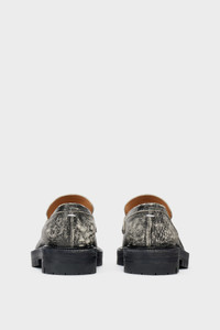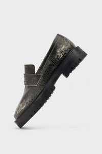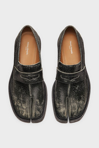 Crafted in crackled black calf leather with sanded detailing, these loafers give the classic penny silhouette a subversive twist. They feature the Tabi split-toe, inspired by the traditional 15th century Japanese sock bearing the same name – launched for the Maison's debut collection in 1989. It captures the avant-garde and insubordinate spirit of the Maison and exists as a heritage classic, continually explored through each collection. Maison Margiela's signature single white stitch appears at the back. Product Details Item ID S58WR0110P7424H8328 Upper: 100% Calf Leather Lining: 100% Ovine Leather Inside: 100% Ovine Leather Sole: 100% Rubber Contrast: 100% Calf Leather Tabi loafers in leather with a crackled finish Chunky rubber lug sole White stitching at the back Made in Italy