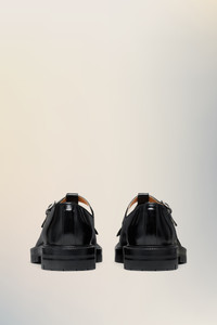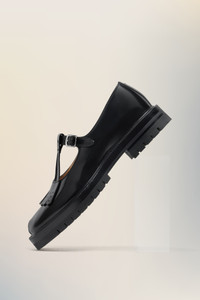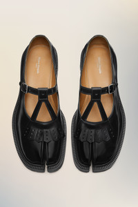With a unique, chunky silhouette, the Tabi County Mary Janes combine a cleated, sturdy sole with a brushed leather upper, defined by a large statement buckle and a signature Mary Jane strap. They feature the Tabi split-toe, inspired by the traditional 15th century Japanese sock bearing the same name – launched for the Maison's debut collection in 1989. It captures the avant-garde and insubordinate spirit of the Maison and exists as a heritage classic, continually explored through each collection. Maison Margiela's signature single white stitch appears at the back. Product Details Item ID S57WR0146P3827H8396 Upper: 100% Calf Leather Lining: 100% Ovine Leather Inside: 100% Ovine Leather Sole: 100% Rubber Contrast: 100% Calf Leather Tabi Mary Jane in polished leather Brogued fringe detailing T-bar strap with metal buckle fastening Rubber lug sole White stitching at the back Made in Italy