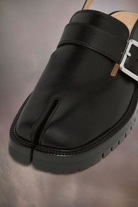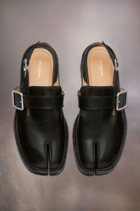 With a chunky silhouette, the County sandals feature a modern cleated sole and large statement buckled front with adjustable heel strap with second buckle. The cut-out back is contrasted by a closed front complete with the Tabi split-toe – inspired by the 15th century Japanese sock of the same name; a Maison mainstay. Product Details Item ID S58WP0283P3292H8396 Upper: 100% Calf Leather Lining: 100% Ovine Leather Inside: 100% Ovine Leather Contrast: 100% Calf Leather Sole: 100% Rubber Contrast: 100% Calf Leather Sandal in box leather Tabi split toe White stitching at the back Adjustable strap Detachable belt with metallic buckle and snap buttons Clean with a gentle leather cleanser Made in Italy