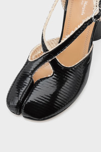 Crafted in high-shine bonded leather, these decollete heels are detailed with an asymmetrical strap that adds length and definition, while frayed edges subtly nod to the Maison’s deconstructive ethos. They feature the Tabi split-toe, inspired by the traditional 15th century Japanese sock bearing the same name – launched for the Maison's debut collection in 1989. It captures the avant-garde and insubordinate spirit of the Maison and exists as a heritage classic, continually explored through each collection. Maison Margiela's signature single white stitch appears at the back. Product Details Item ID S58WL0304P7429H8650 Upper: 100% Ovine Leather Backside: 100% Cotton Inside: 100% Ovine Leather Contrast: 100% Ovine Leather Sole: 100% Calf Leather Contrast: 100% Rubber Tabi criss-cross pumps in patent leather Frayed cotton detail Buckle-fastening strap Round block heel White stitching at the back Made in Italy