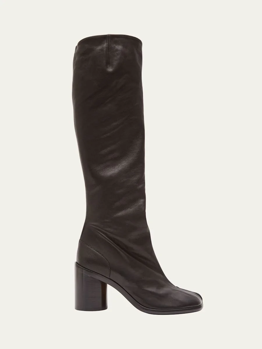Maison Margiela "Tabi" knee-high leather boots 3.15 in / 80 mm block heel; 0.25 in / 10 mm platform Round split toe Leather/Rubber outsole Lining: Leather Spot clean, wipe clean Made in Italy Online Inquiries: BGS21_X6XJ0| Store Inquiries: #5039168