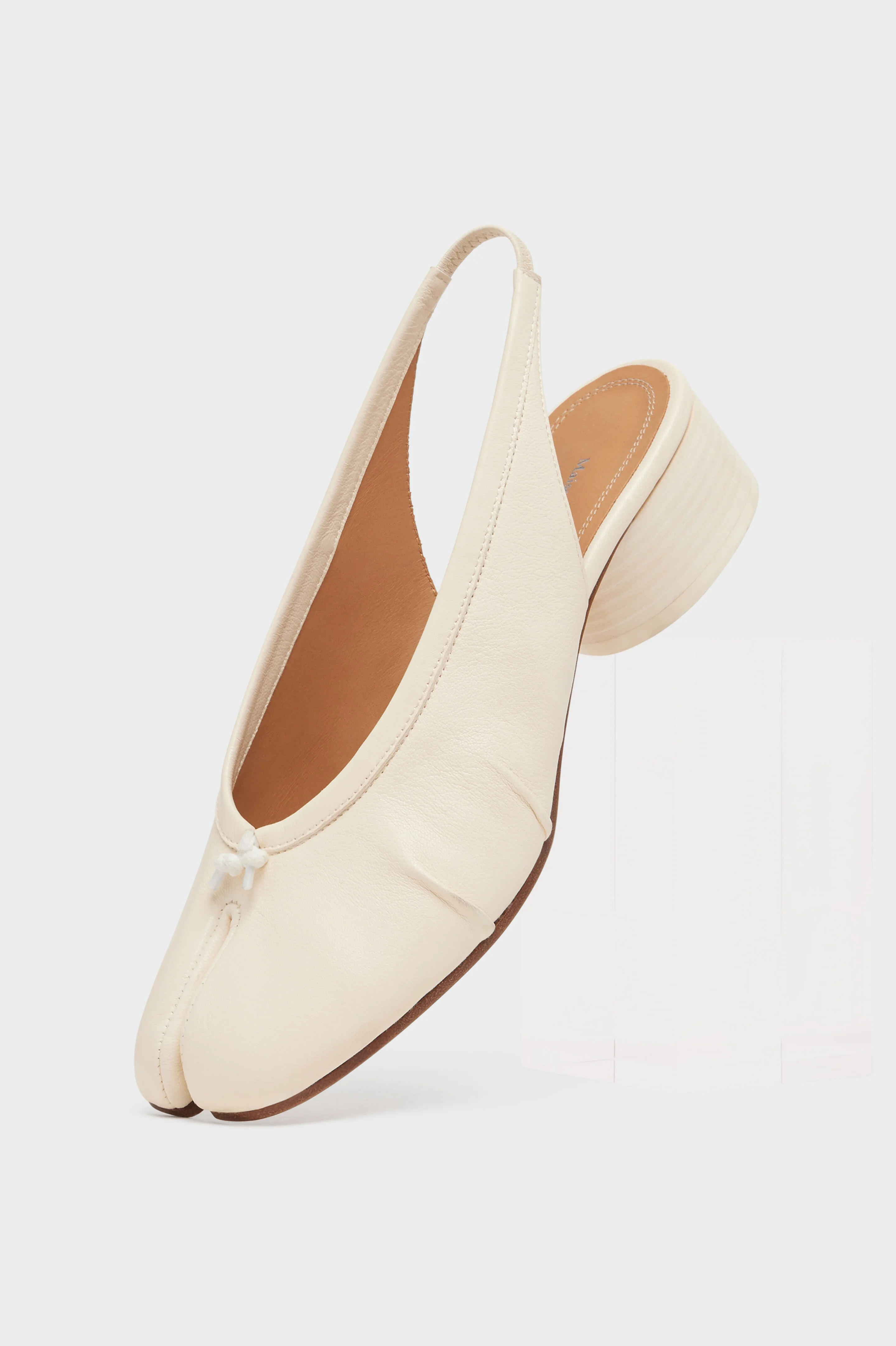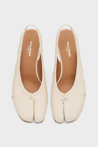 Maison Margiela presents the Tabi new ballerinas, which take their design from ballerina shoes in the house archives. The slingbacks have a 3cm heel and are crafted in soft nappa leather, with a handcrafted used treatment applied at the folds, base and seams, manually worked to create an artisanal vintage effect. They feature the Tabi split-toe, inspired by the traditional 15th century Japanese sock bearing the same name – launched for the Maison's debut collection in 1989. It captures the avant-garde and insubordinate spirit of the Maison and exists as a heritage classic, continually explored through each collection. Product Details Item ID S58WZ0141P6378T1003 Upper: 100% Calf Leather Lining: 100% Ovine Leather Inside: 100% Ovine Leather Contrast: 100% Calf Leather Sole: 100% Calf Leather Contrast: 100% Rubber Tabi slingback heeled mules in leather Notched vamp Front knotted detail Stacked block heel Maison Margiela signature at the insole Made in Italy