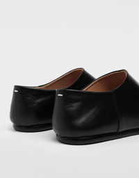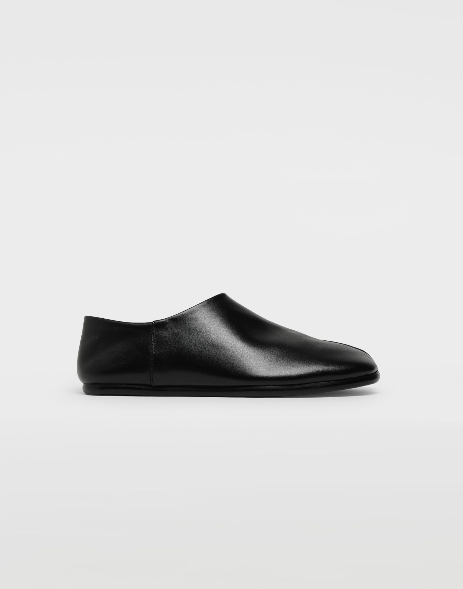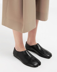 The Maison's iconic Tabi is reworked in this leather slip-on rendition. These shoes feature full leather lining with contrasting flat soles and the Maison's iconic straight white stitch exposed on the back. Item details 100% Bovine leather Basic solid colour Leather sole