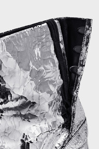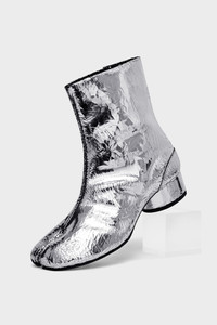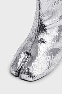 Crafted in a broken mirror finish, these low-heeled ankle boots feature the Tabi split-toe, inspired by the traditional 15th century Japanese sock bearing the same name – launched for the Maison's debut collection in 1989. It captures the avant-garde and insubordinate spirit of the Maison and exists as a heritage classic, continually explored through each collection. Product Details Item ID S58WU0273P5016T9002 Upper: 100% calf leather Lining: 100% lamb leather Inside: 100% lamb leather Sole: 100% calf leather Contrast: 100% rubber Heel height: 3 cm/1,1 in Cylindrical heel Ankle boots with broken mirror effect Tabi split toe White stitching at the back Hook closure Made in Italy A digital certificate provided by the Aura Blockchain Consortium guarantees the authenticity of this product. Discover more on auraluxuryblockchain.com/#about