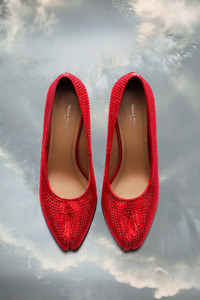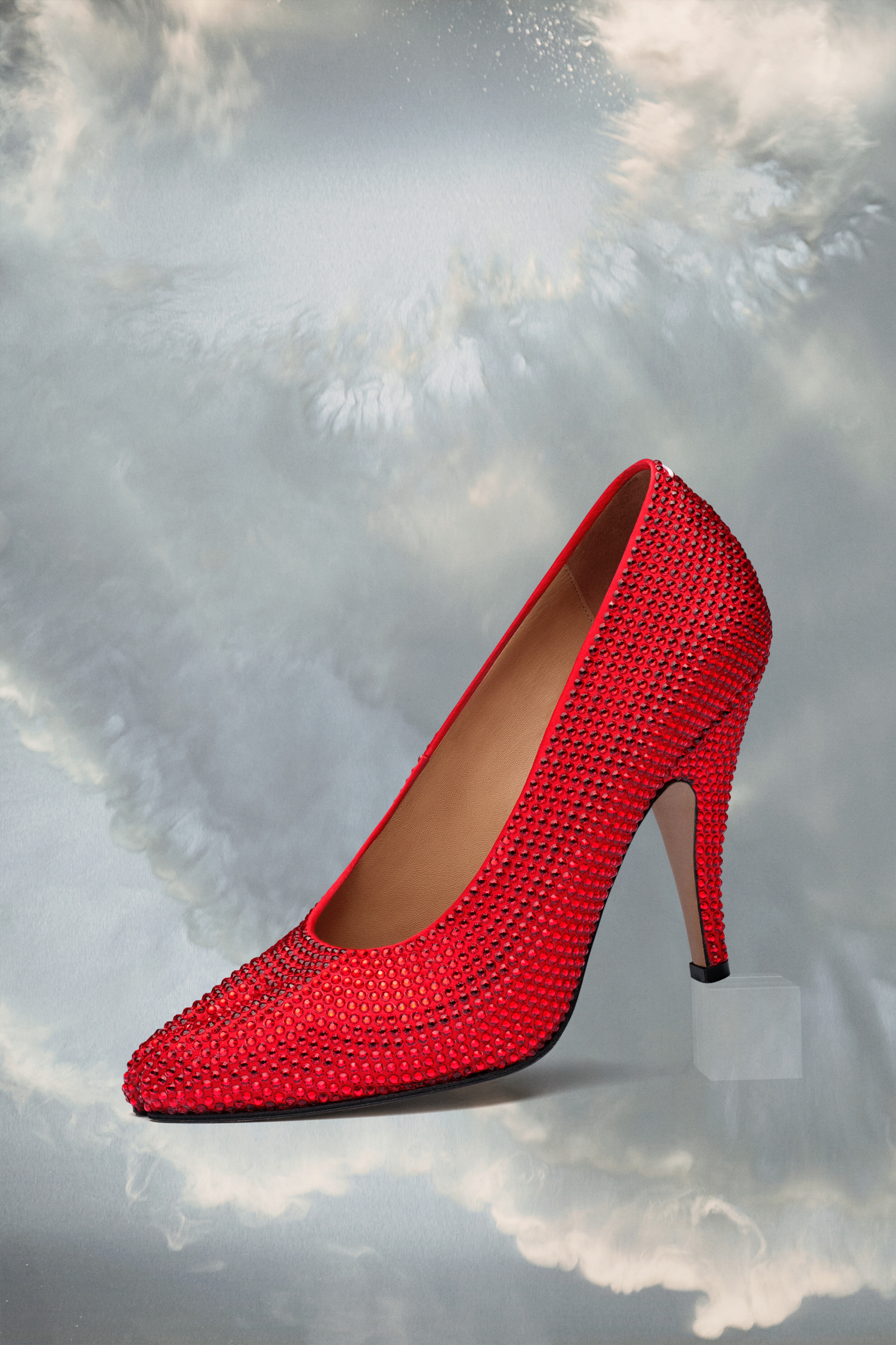 The rhinestone pumps feature a Tabi pointed toe, a new iteration of the iconic style, and are lined with a calf leather sole, with visible numerical logo. Maison Margiela’s signature white stitch appears at the back. The Tabi split-toe is inspired by the traditional 15th century Japanese sock bearing the same name – launched for the Maison’s debut collection in 1989. It captures the avant-garde and insubordinate spirit of the Maison and exists as a heritage classic, continually explored through each collection. Product Details Item ID S39WL0124P5157T4028 COED Fall Winter 2023 Application: 100% Rhinestones Upper: 72% Viscose-Rayon 28% Silk Lining: 100% Lamb leather Inside: 100% Lamb leather Sole: 100% Calf leather Heel height: 11 cm/4,3 in Pointed Tabi shape White stitching at the back Brand logo on the sole Internal logo stamping Made in Italy A digital certificate provided by the Aura Blockchain Consortium guarantees the authenticity of this product. Discover more on auraluxuryblockchain.com/#about