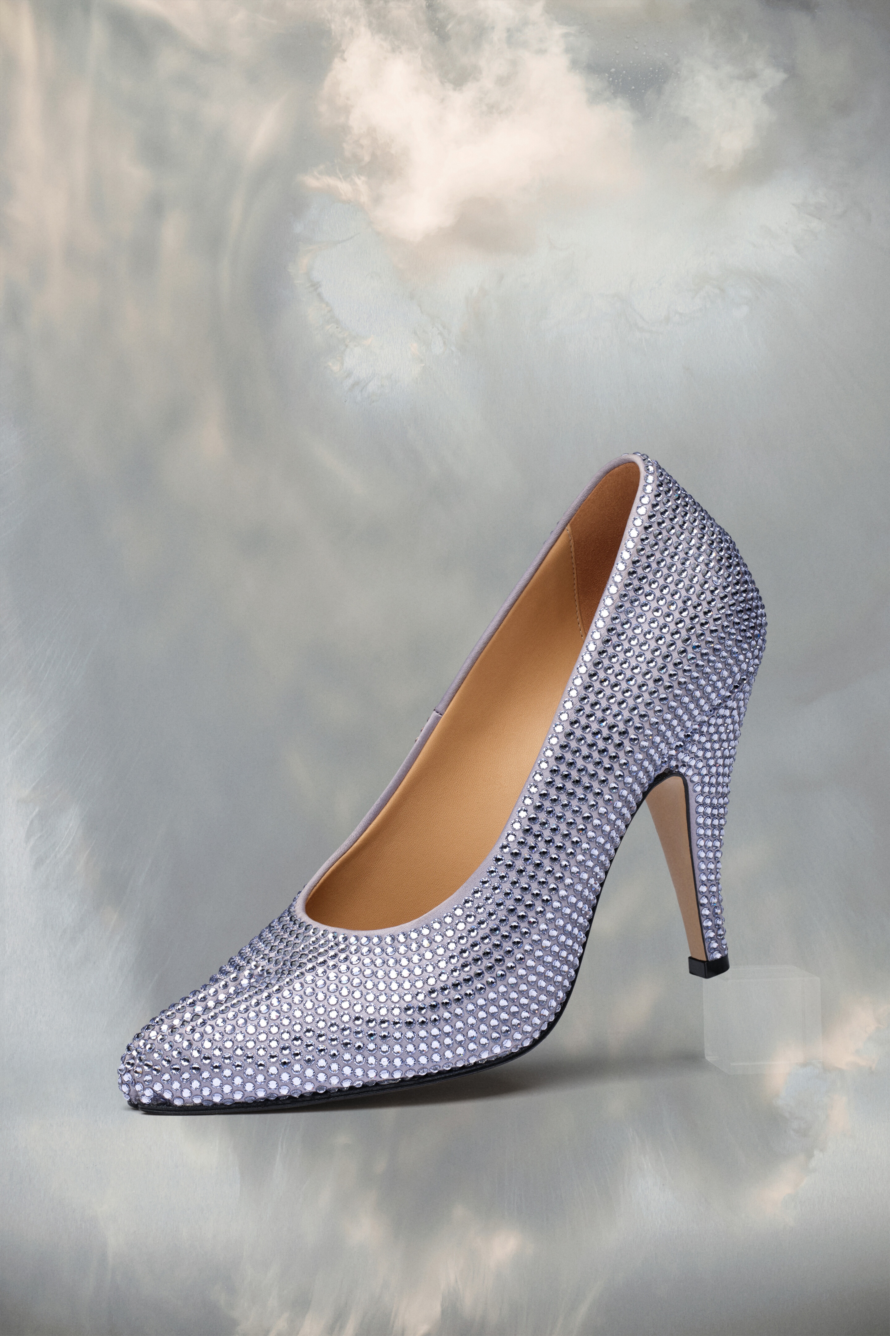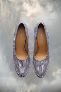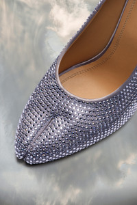 The rhinestone pumps feature a Tabi pointed toe, a new iteration of the iconic style, and are lined with a calf leather sole, with visible numerical logo. Maison Margiela’s signature white stitch appears at the back. The Tabi split-toe is inspired by the traditional 15th century Japanese sock bearing the same name – launched for the Maison’s debut collection in 1989. It captures the avant-garde and insubordinate spirit of the Maison and exists as a heritage classic, continually explored through each collection. Product Details Item ID S39WL0124P5157T5166 COED Fall Winter 2023 Application: 100% Rhinestones Upper: 72% Viscose-Rayon 28% Silk Lining: 100% Lamb leather Inside: 100% Lamb leather Sole: 100% Calf leather Heel height: 11 cm/4,3 in Pointed Tabi shape White stitching at the back Brand logo on the sole Internal logo stamping Made in Italy A digital certificate provided by the Aura Blockchain Consortium guarantees the authenticity of this product. Discover more on auraluxuryblockchain.com/#about