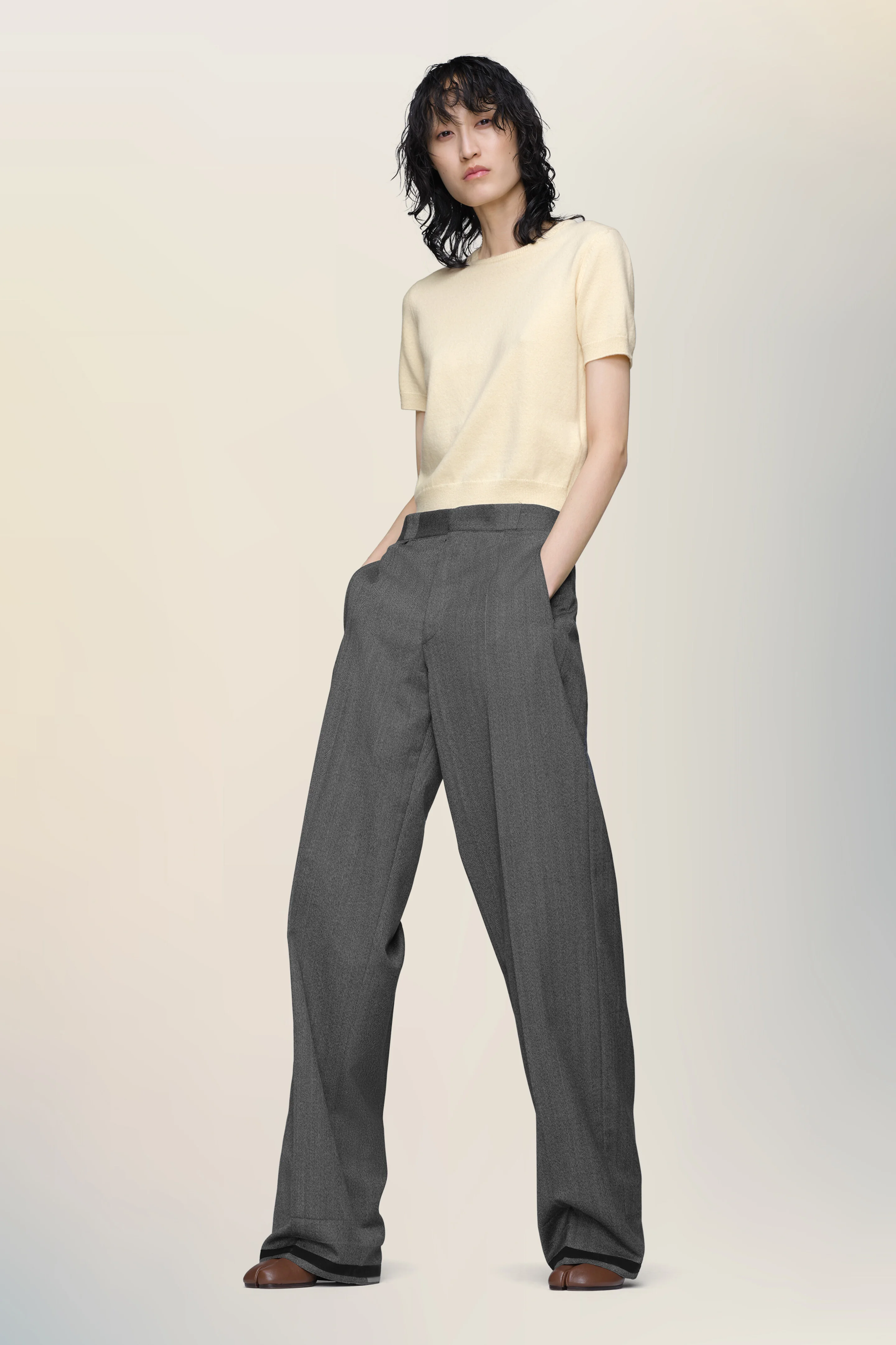 Cut in herringbone wool, these trousers combine structured drape with fluid volume to reinterpret classic suiting. A contrast finish at the hem reveals the Maison’s Memory of the Hem technique – preserving a trace of past construction. Maison Margiela’s signature, the four stitches, appear at the back; the opposite of a label. Product Details Item ID S51KA0607M35513860F Primary Fabric: 50% Polyester 50% Wool Lining: 100% Cupro Pocket Lining: 100% Cotton Wool-blend tailored trousers Straight-leg silhouette Pressed creases at the front Contrast trim detail at the cuffs Four stitches at the back Made in Italy