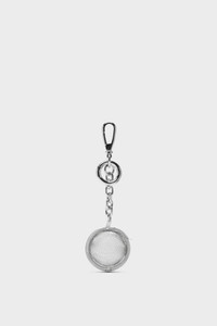 The Tea Infuser Charm transforms a functional object into a playful accessory. Crafted in polished metal, it opens to reveal a perforated interior, recalling a traditional tea strainer. Suspended from a detachable chain, it transitions from pocket piece to bag charm. At the front, the engraved logo asserts the Maison’s identity. Product Details Item ID SA1UA0013P8834H7161 Composition: 100% steel, 100% brass, 100% zama Functional mesh sphere with hinged closure Polished chain with snap hook and ring Key ring accessory Made in Italy