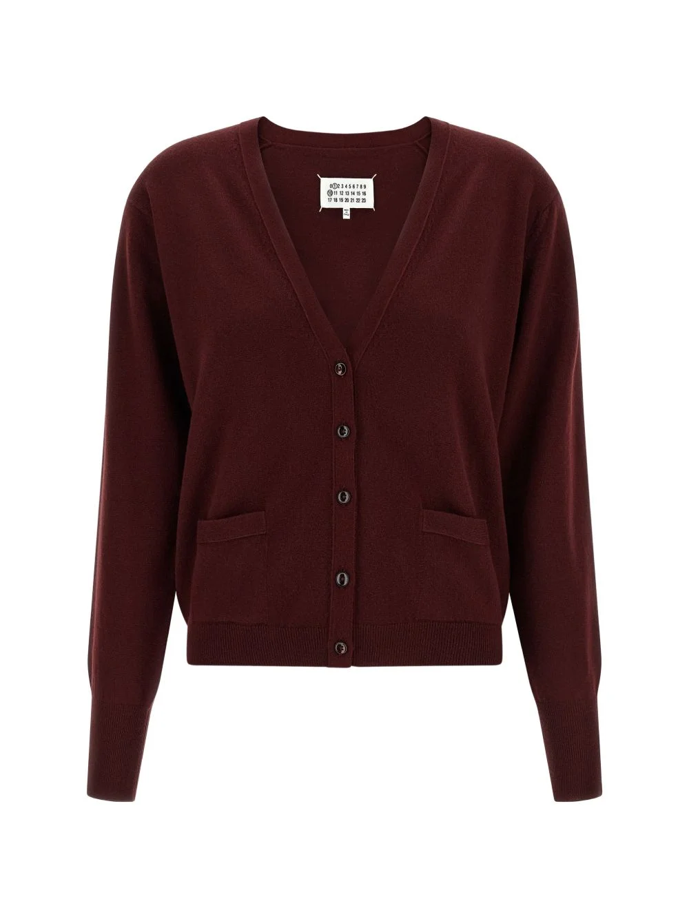 V-neck cardigan Highlights - Burgundy - V-neck - Front button closure - Front pockets - Long cuffed sleeves - Four stitches at the back Made in Italy Composition Virgin Wool 100% Washing instructions Read Manufacturer Guidelines