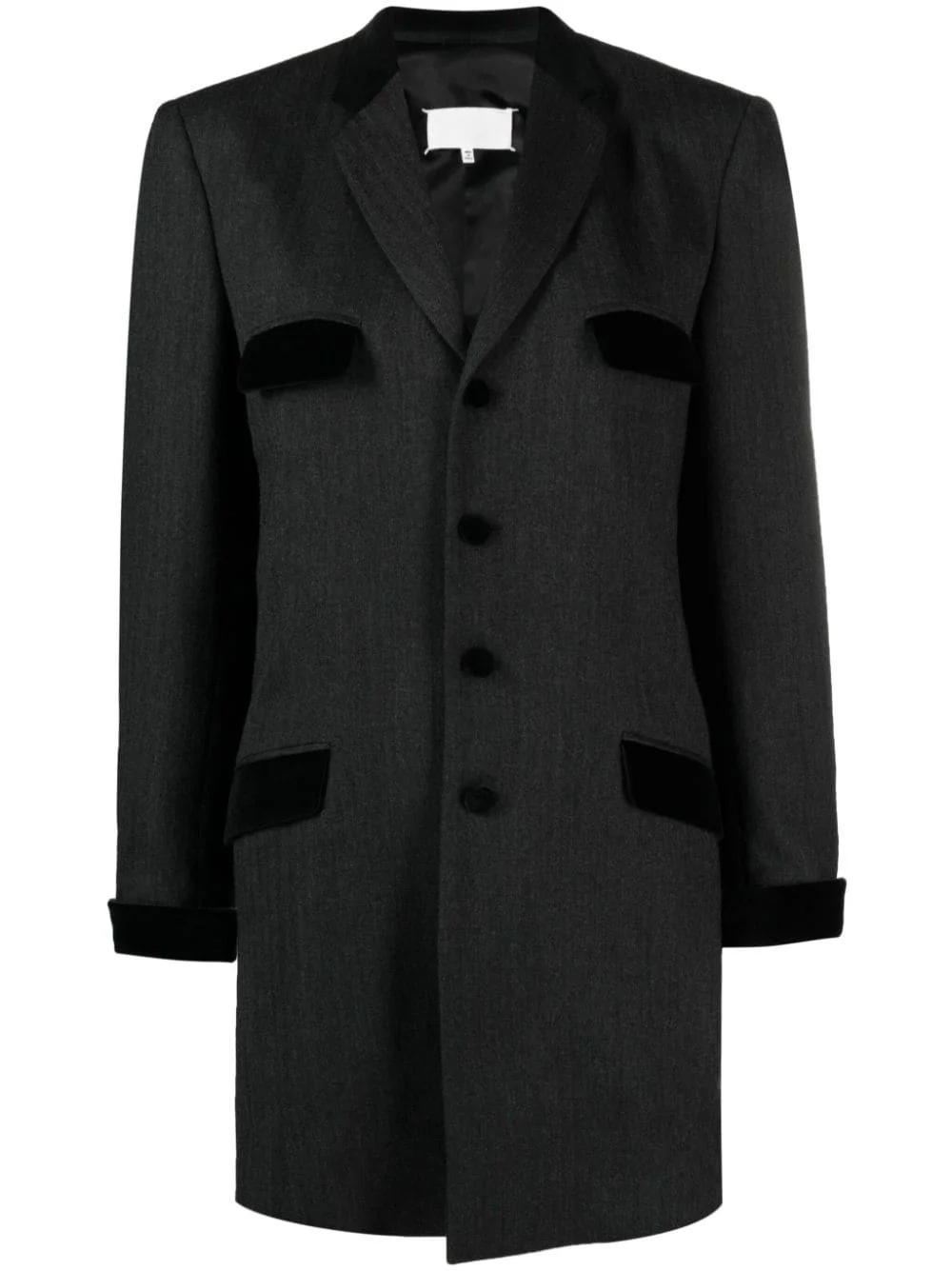 velvet-trim wool single-breasted coat Highlights - Charcoal grey/black - Wool - Herringbone pattern - Signature four-stitch logo - Velvet trim - Notched lapels - Front button fastening - Long sleeves - Multiple flap pockets - Full lining Made in Italy Composition Outer: Wool 100%, Cotton 83%, Modal 17% Lining: Viscose 55%, Cotton 45% Washing instructions Dry Clean Only