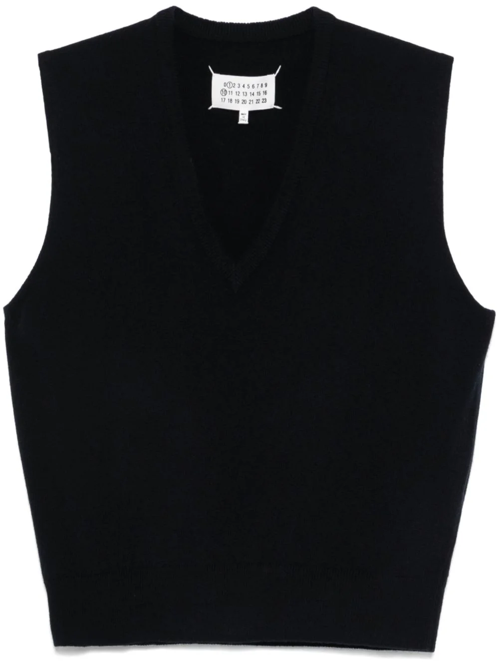 virgin wool vest Highlights - Navy blue - Signature four-stitch logo - Ribbed v-neck - Sleeveless Made in Italy Composition Virgin Wool 100% SIZE & FIT Model measurements Height 5 ft 10 in(1.78 m) Bust/Chest 33.46 in(85 cm) Hips 36.22 in(92 cm) Waist 23.22 in(59 cm) FittingInformation Designed for a relaxed fit, this piece allows for comfort and movement when worn Made with a midweight knit, this piece offers some stretch