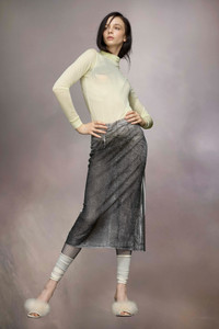 The long-sleeved bodysuit in viscose jersey has a high-neck and sheer finish. Maison Margiela’s signature, the Four stitches, appear at the back; the opposite of a label. Product Details Item ID S51NA0098S24639150 Fabric: 100% viscose-rayon Viscose jersey body Turtleneck Long sleeve Snap button closure Four stitches at the back Made in Italy Model is 178cm tall and wears a size 40.