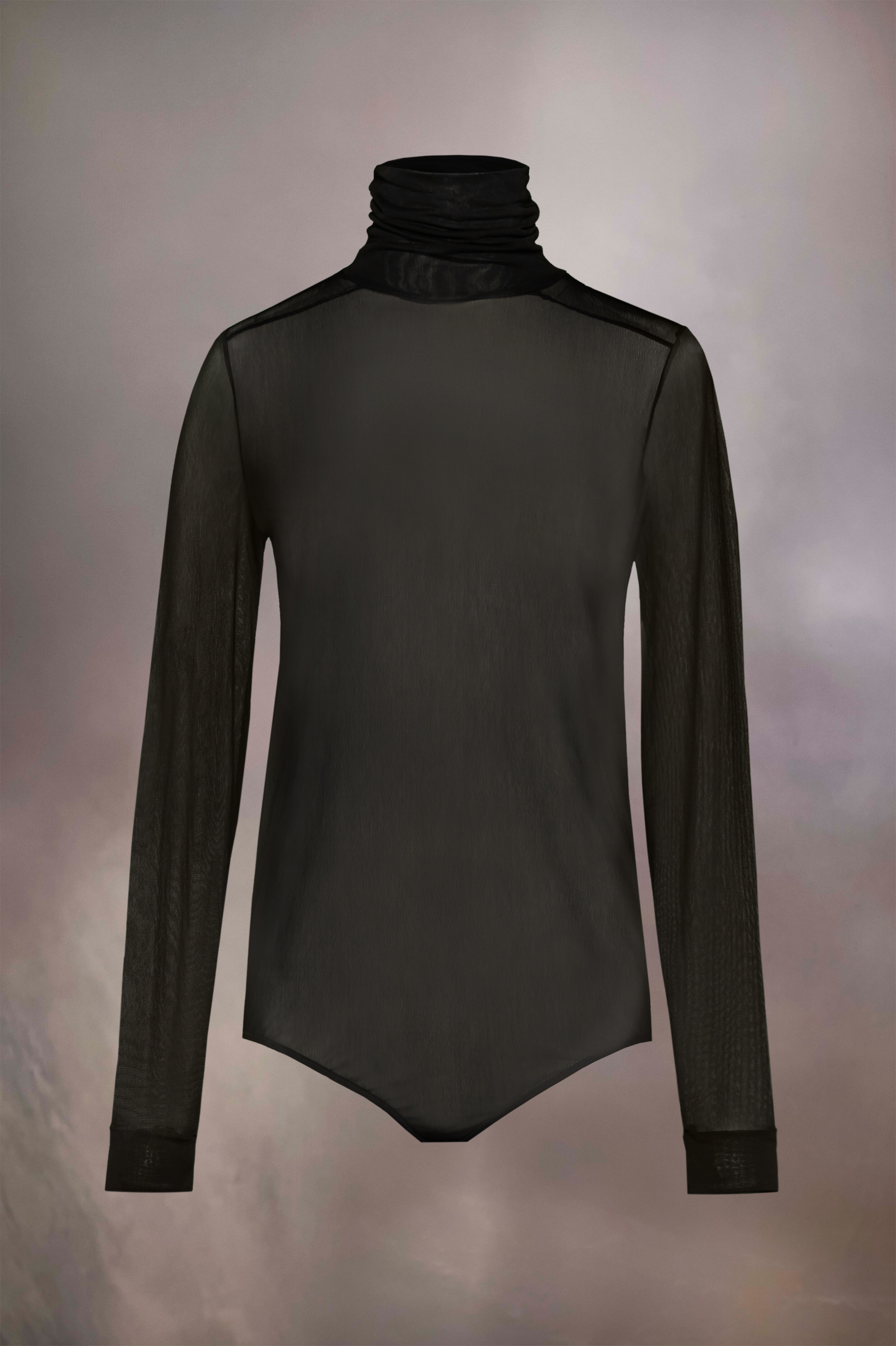 The long-sleeved bodysuit in viscose jersey has a high-neck and sheer finish. Maison Margiela’s signature, the Four stitches, appear at the back; the opposite of a label. Product Details Item ID S51NA0098S24639900 Fabric: 100% viscose-rayon Viscose jersey body Turtleneck Long sleeve Snap button closure Four stitches at the back Made in Italy Model is 178cm tall and wears a size 40.