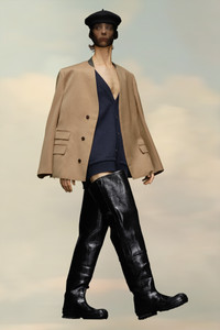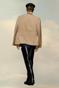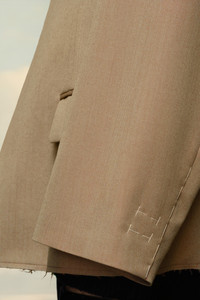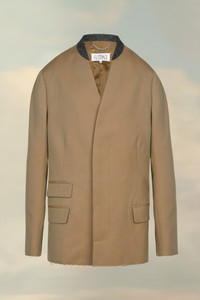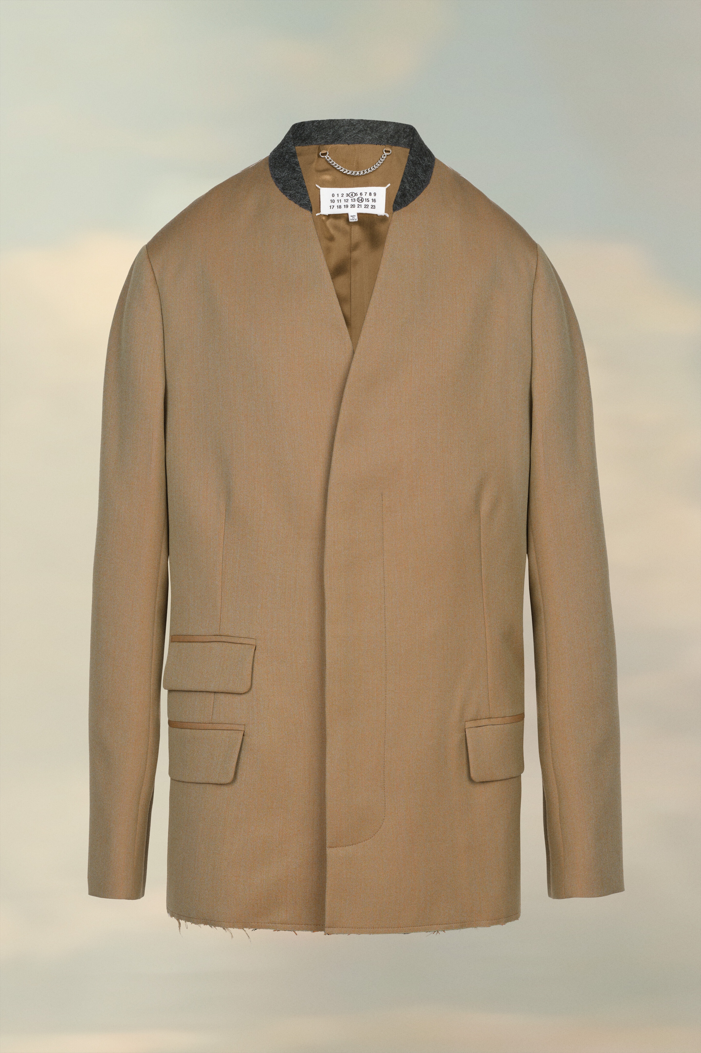 A blazer in wool with a mandarin collar and asymmetric pockets. It features a contrast collar, the memory of cuffs and four white stitches at the back showing the hand of the Maison: the opposite of a label. Product Details Item ID SI1BN0001S54330740M Outer: 100% Wool Lining: 65% Acetate, 35% Viscose-Rayon Pocket lining: 100% Cotton Collarless jacket Y-neckline Concealed front button fastening Front flap pockets Basting stitch on cuffs and shoulders Raw hem Four stitches at the back Made in Italy The model is 6'2" tall and wears size 46.