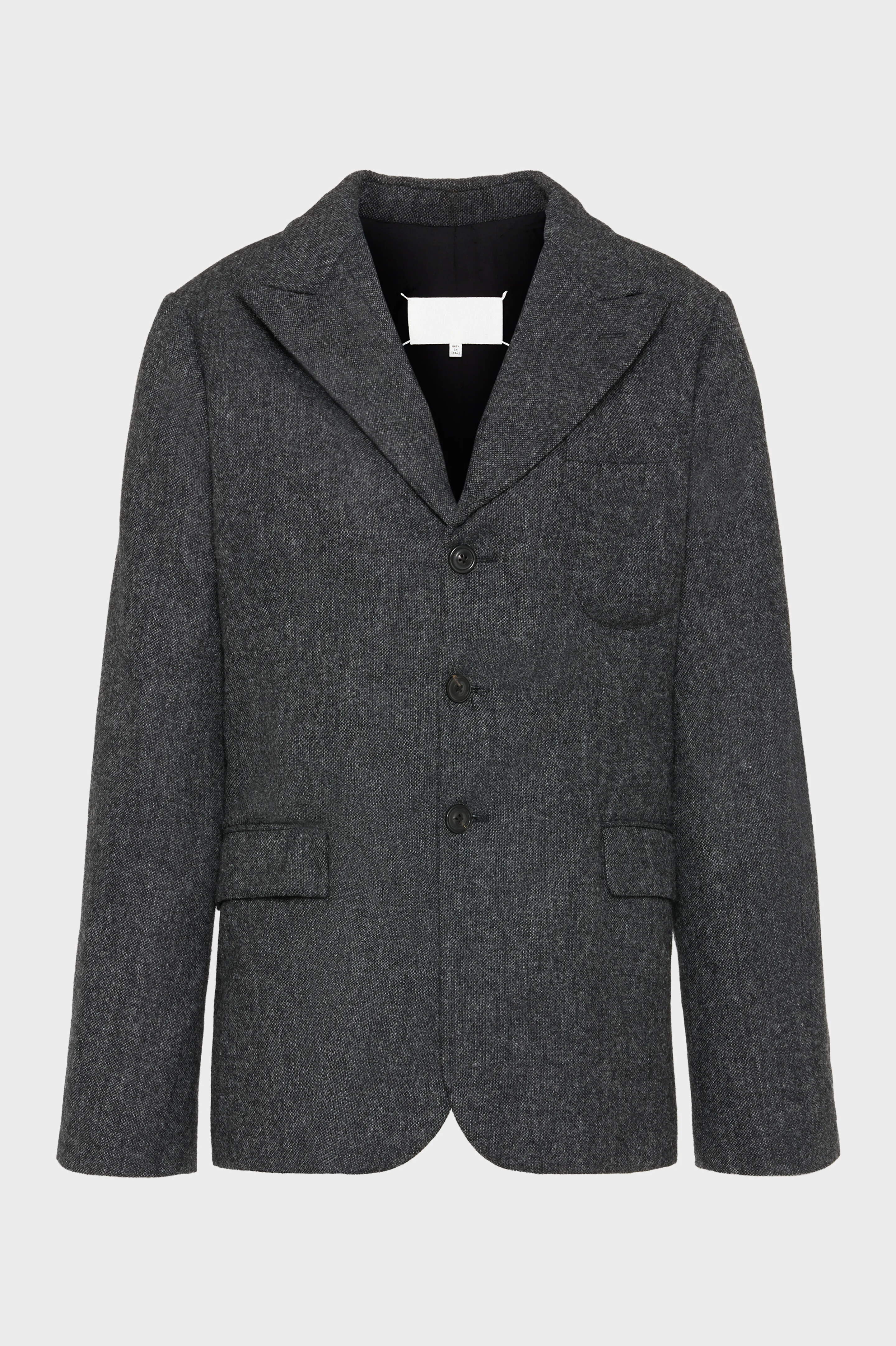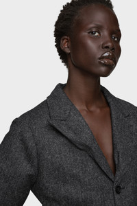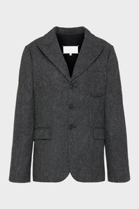 This wool jacket is shaped using the Maison’s Gestural Cutting technique – a method that captures the expressive movements of everyday dressing. With subtly misshapen details that evoke the unconscious act of getting dressed, the piece appears instinctively arranged, as if thrown on in haste. Maison Margiela’s signature, the four stitches, appear at the back; the opposite of a label. Product Details Item ID S29BN0412M35569855M Primary Fabric: 100% Wool Lining: 100% Viscose-Rayon Pocket Lining: 55% Viscose-Rayon, 45% Cupro Single-breasted wool jacket Notch lapels with irregular curvature Chest patch pocket and two flap pockets at the waist Buttoned cuffs Four stitches at the back Made in Italy