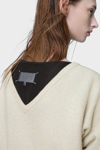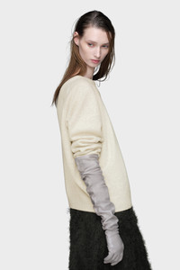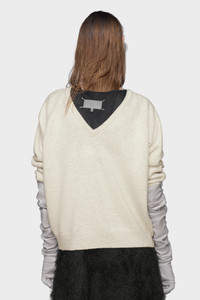 A soft knit top in pure wool, shaped with raglan sleeves and a relaxed silhouette. The wide neckline dips into a V at the back, revealing subtle detail through a simple shift in orientation. At the back, the Maison’s signature four stitches appear; the opposite of a label. Product Details Item ID S29HN0015M13179800M Primary fabric: 100% Wool Wool top with wide round neckline Raglan long sleeves V-shaped back neckline Ribbed cuffs and hem Made in Italy