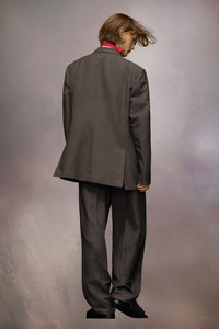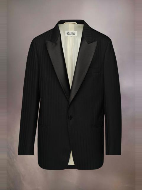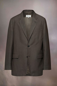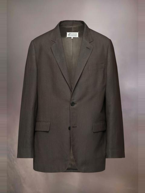 In wool linen, the single-breasted jacket has a notched collar and asymmetric pockets. It is oversized with a double back vent. Maison Margiela's signature, the four stitches, appear at the back; the opposite of a label. The model is 185cm tall. Model wears size 40.