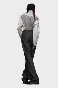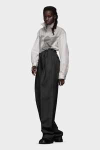 Made in wool mohair, the trousers showcase the Maison's Work-in-progress stitches around the waist. The casual drawstring is contrasted with smart pleats. They feature a hand-applied greasy patina technique for a lived-in look. Maison Margiela's signature, the Four stitches, appear at the back; the opposite of a label. Product Details Item ID S51KA0572M35141859 Composition: 60% mohair, 40% wool Pocket lining: 100% cotton Wool mohair trousers Regular waist Wide leg Front pleats Basting stitches Drawstring on waist Horn button closure Hand-applied Greasy Patina technique Side pockets Four stitches at the back Made in Italy Model is 5'8" tall and wears a size 40.