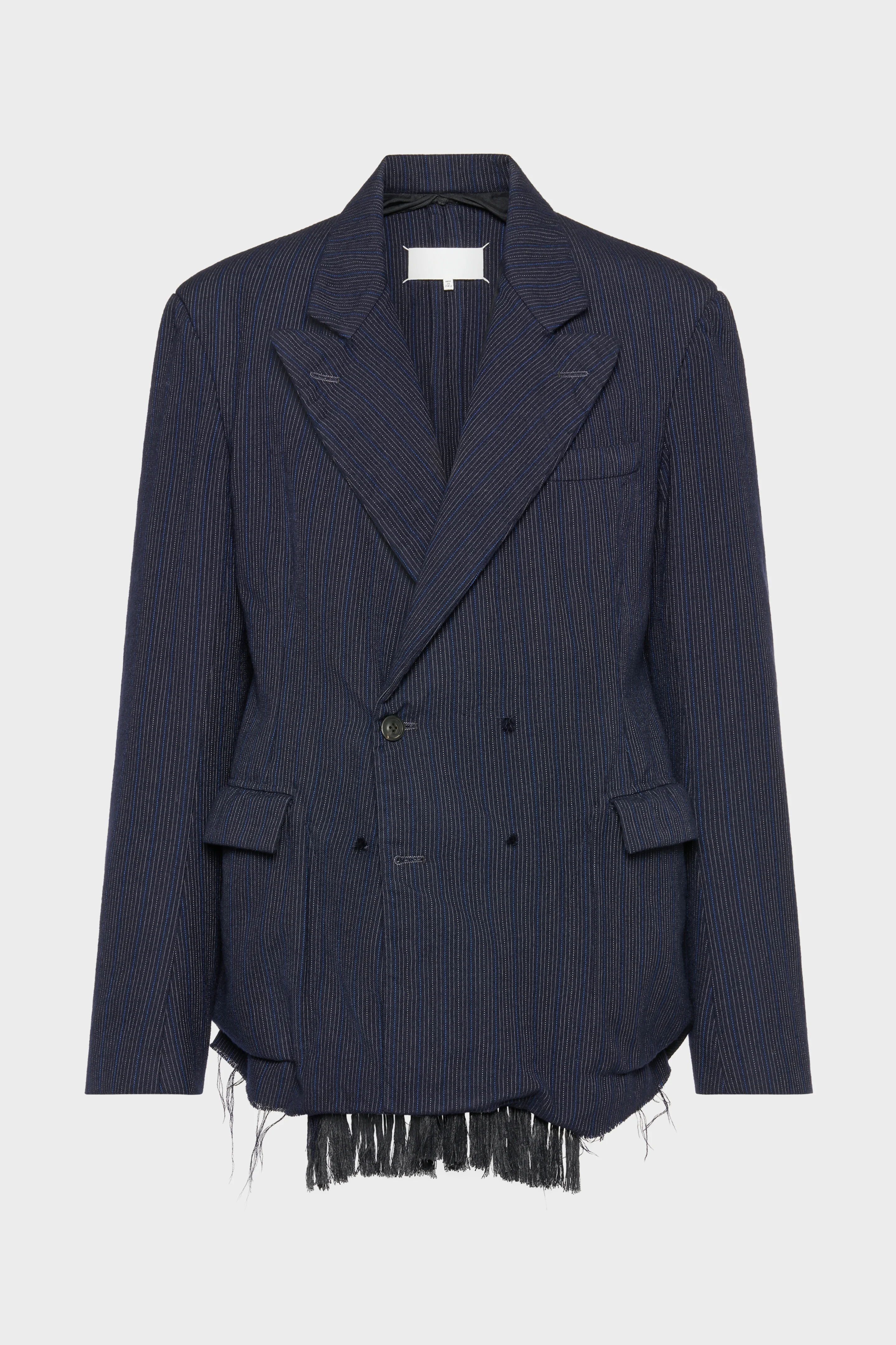 This jacket is crafted in wool woven with a fine pinstripe. Cut with a relaxed silhouette, it features softly padded shoulders, notch lapels and flap pockets at the waist. An integrated internal scarf, lifted from a vintage design, adds subtle function to the piece. The exposed buttonholes reveal the memory of a fastening – a quiet expression of the Maison’s deconstructive approach to tailoring. Maison Margiela’s signature, the four stitches, appear at the back; the opposite of a label. Product Details Item ID S29BN0411M35558511F Primary Fabric: 96% Wool, 4% Polyester Lining: 55% Cotton 45% Cupro Pocket Lining: 100% Cotton Sleeve Lining: 100% Cotton Jacket in pinstriped woven wool Notch lapels and flap waist pockets Irregular hem detail Light shoulder padding Four stitches at the back Made in Italy