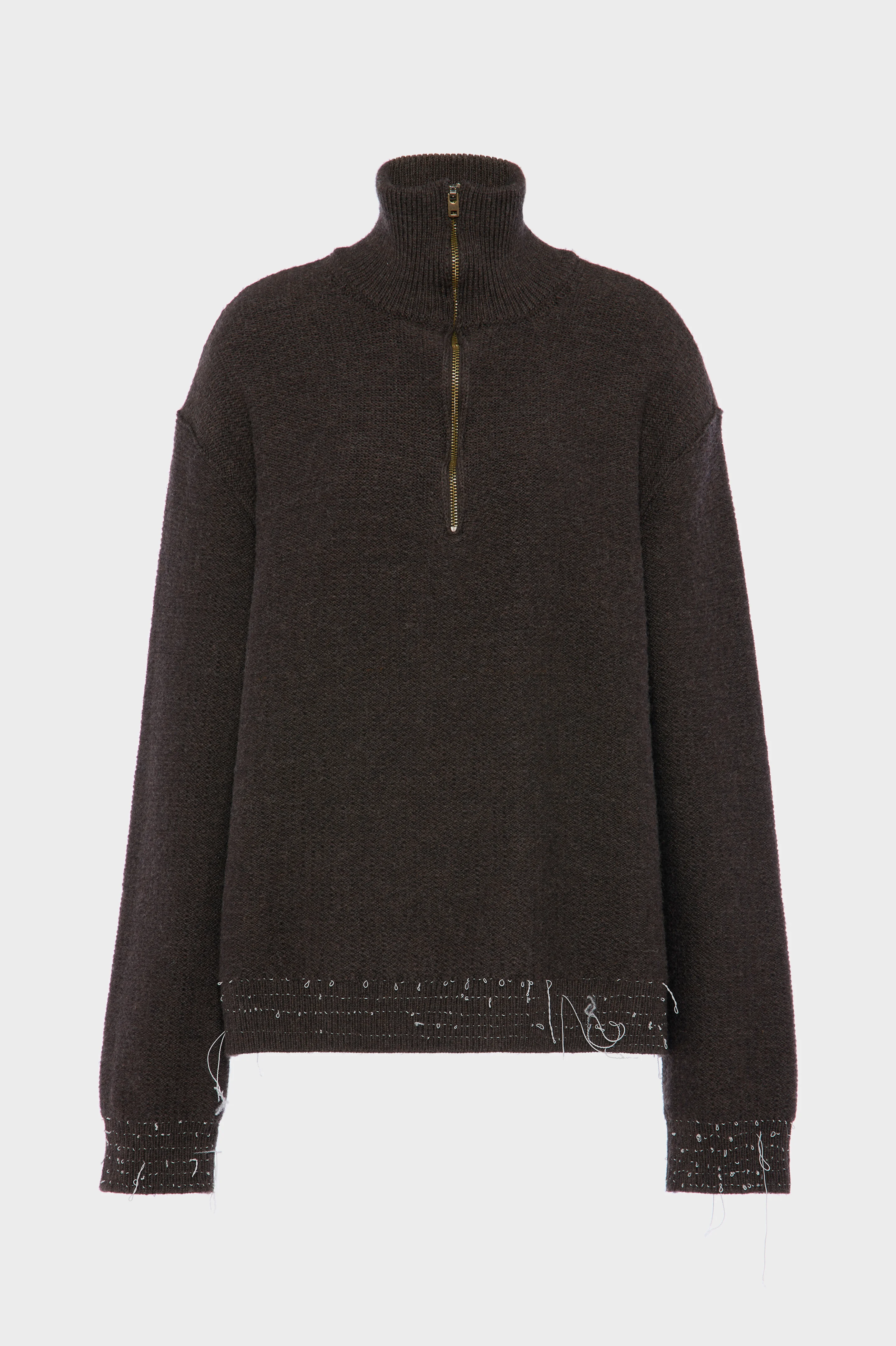 This quarter-zip sweater is crafted in textured wool with an intentionally raw sensibility. The relaxed silhouette is anchored by ribbed trims, while loose threads along the hem and cuffs expose the construction in progress. At the back, the Maison’s signature four stitches appear; the opposite of a label. Product Details Item ID S51HL0040M13227143F Primary fabric: 100% wool Gauge 5/broken elastic knits Decorative loose stitching at hem and cuffs Long sleeves Turtleneck Center zipper closure Four stitches at the back Made in Italy