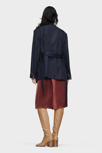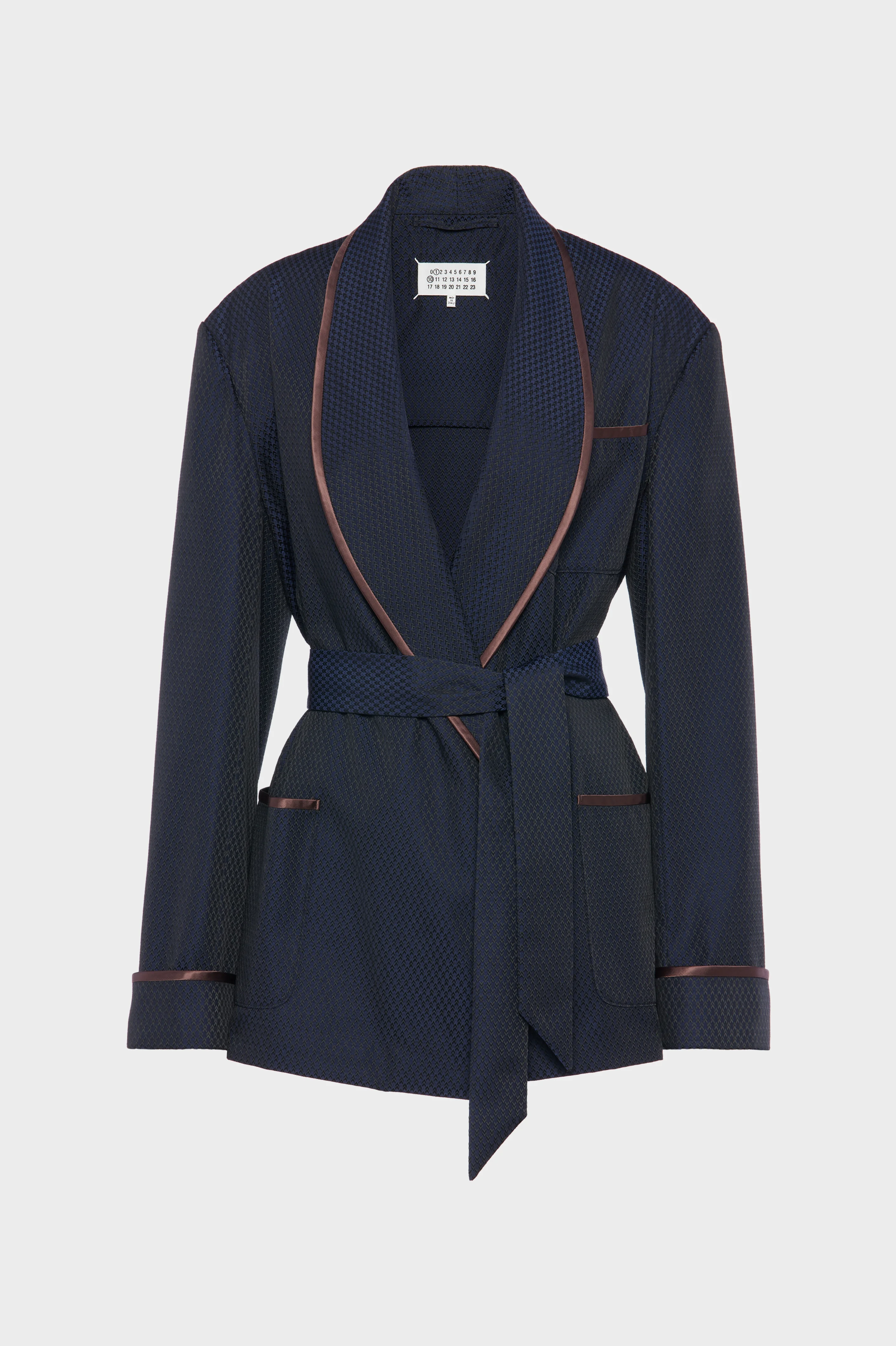 This jacket is cut from virgin wool with a tonal jacquard weave, its structure balanced by the softness of a belted waist. The design takes inspiration from the Robe de Chambre, reworking the dressing gown into a tailored silhouette. Satin piping defines the collar, cuffs, and pockets, while a tie closure secures the relaxed line. At the back, the Maison’s signature four stitches appear; the opposite of a label. Product Details Item ID S51BN0440M35683002J Primary fabric: 68% polyester 32% virgin wool Lining: 100% viscose-rayon Bicolor jacquard Long sleeves Shawl collar neckline Waist tie closure Four stitches at the back Made in Italy