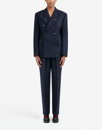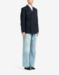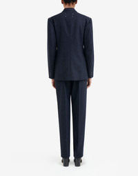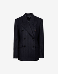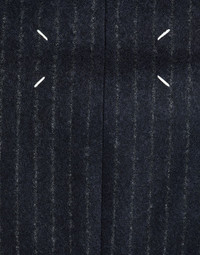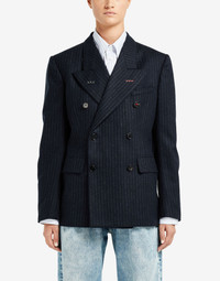 Fitted double-breasted suit jacket in striped wool with work-in-progress details and 'Memory of' cuffs. It features flap pockets and the M button embroidered in ref – part of the identity of the ICONS collection. The Maison's four-stitches moniker adorns the back. Made in Italy. Item details 100% Wool Flannel Brand logo Pinstriped Lapel collar Long sleeves External flap pockets One inside pocket Button closing Partially lined interior