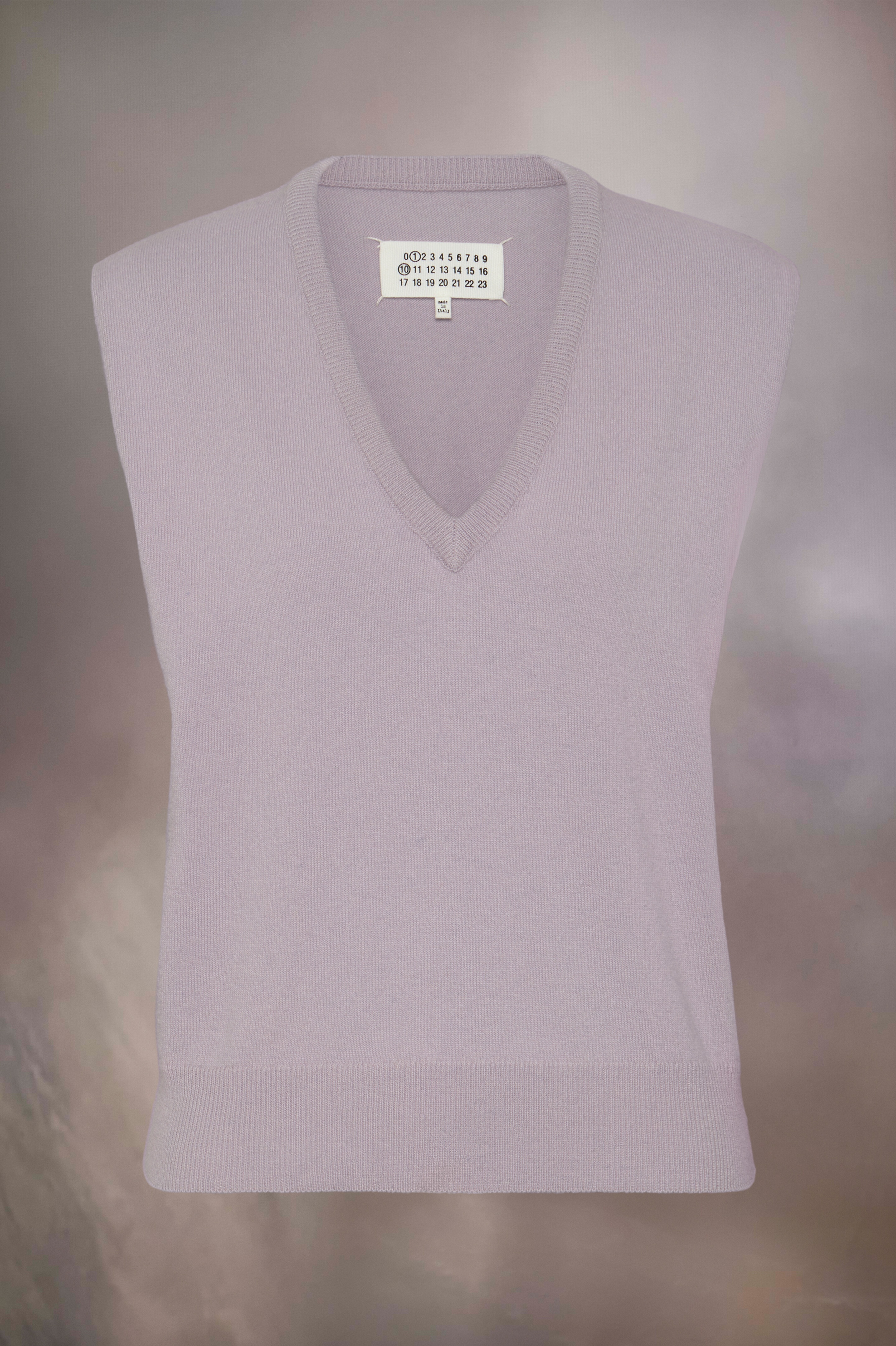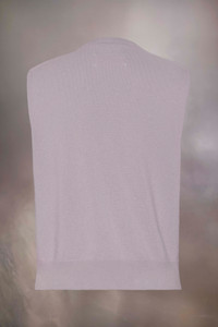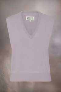 In virgin wool, the minimal knitwear top has a classic V-neck design and offers a relaxed fit. It is sleeveless with ribbed trims around the neck and at the wide hem for further texture. Maison Margiela's signature, the four stitches, appear at the back; the opposite of a label. Product Details Item ID S51FB0077M13090368 Primary Fabric: 100% Virgin Wool Gauge 12 Virgin wool vest V-neck Ribbed trims Four stitches at the back Made in Italy