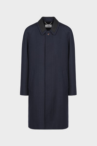 Crafted from wool viscose, the coat features a contrast collar and a button at the top with a hidden placket for a clean aspect. A single vent finishes the design. Maison Margiela's signature, the four stitches, appear at the back; the opposite of a label. Product Details Item ID SI0AA0003S54959511 Composition: 52% Viscose, 48% Virgin wool Pointed collar Button closure with red M embroidery Covered buttons Side pockets Four stitches at the back Made in Italy The model is 5'10" tall and wears size 40.