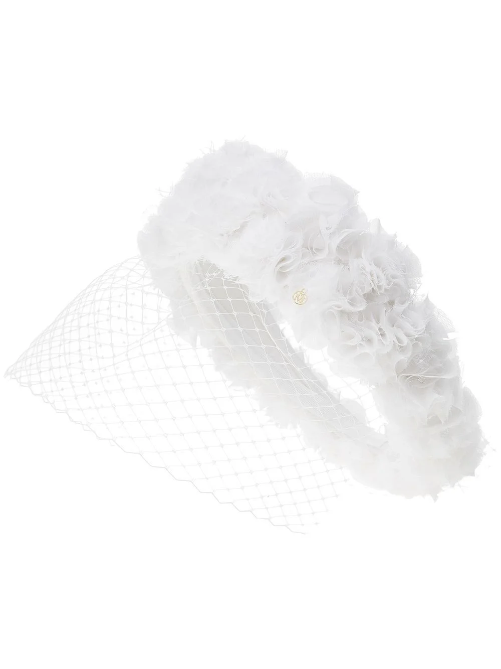 Constance tulle-detail tiara white wool felt tulle overlay floral applique tulle netting veil detail gold-tone logo plaque medallion pendant Made in France Composition Wool Felt 100%, Polyamide 60%, Silk 40%