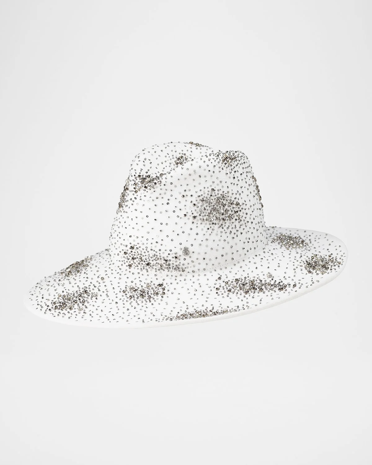 - Mason Michel "Neva" felt fedora with glass snowflake embellishments - Pinched crown - Flat, wide brim - Item Weight (Lbs.): 0.5 - Wool/brass/polyester - Made in France