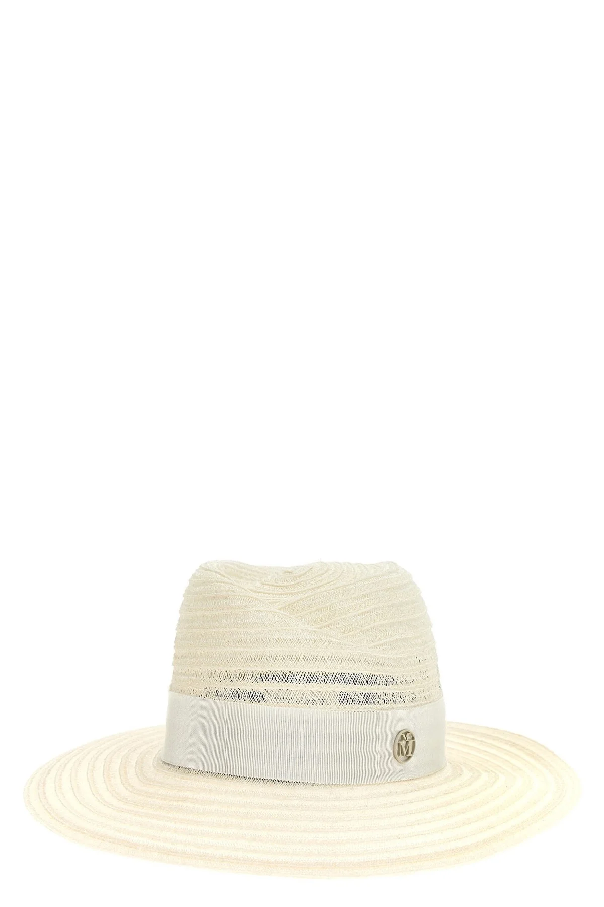 cod. 1001048003WHITE Virginie' hemp straw hat, Fedora model with grosgrain ribbon and tone-on-tone metal logo, wavy fold detail on the front on the cap. Color: White Size & Fit: true to size fit Composition: 100% hemp Made in: Italy
