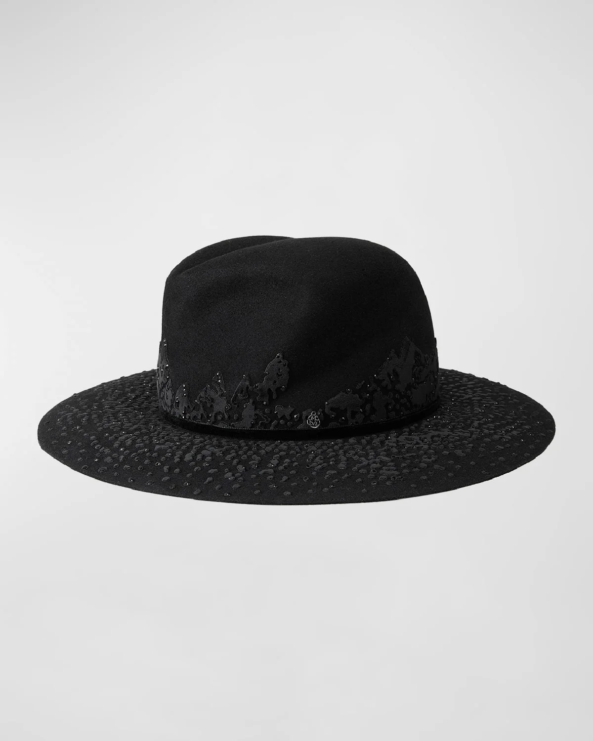 - Maison Michel "Yoshiko" fedora in wool, nylon/polyamide, and rhinestones - Pinched crown - Monogram charm accent - Slim velvet band on break - Flat, wide brim - Item Weight (Lbs.): 0.3 - Made in Italy