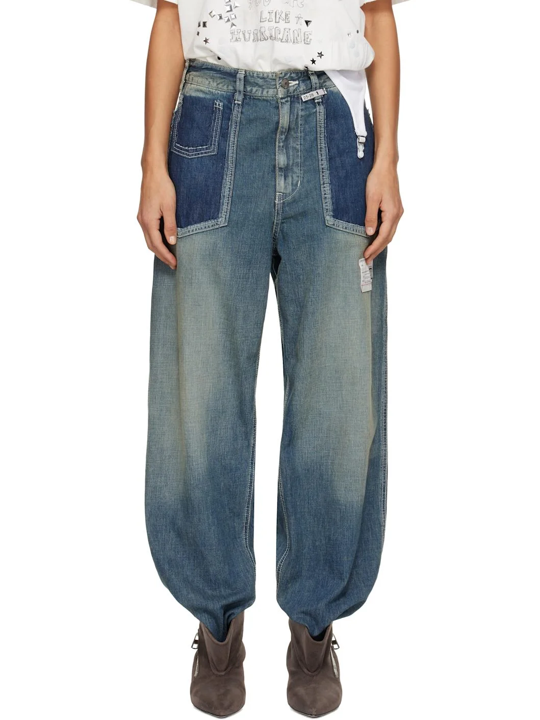 Non-stretch denim jeans. · Fading, raw edges, and distressing throughout · Belt loops and concealed drawstring at waistband · Four-pocket styling · Zip fly · Logo patch at front · Drawstring at cuffs Supplier color: Indigo 100% cotton. Made in Japan 252551F069000