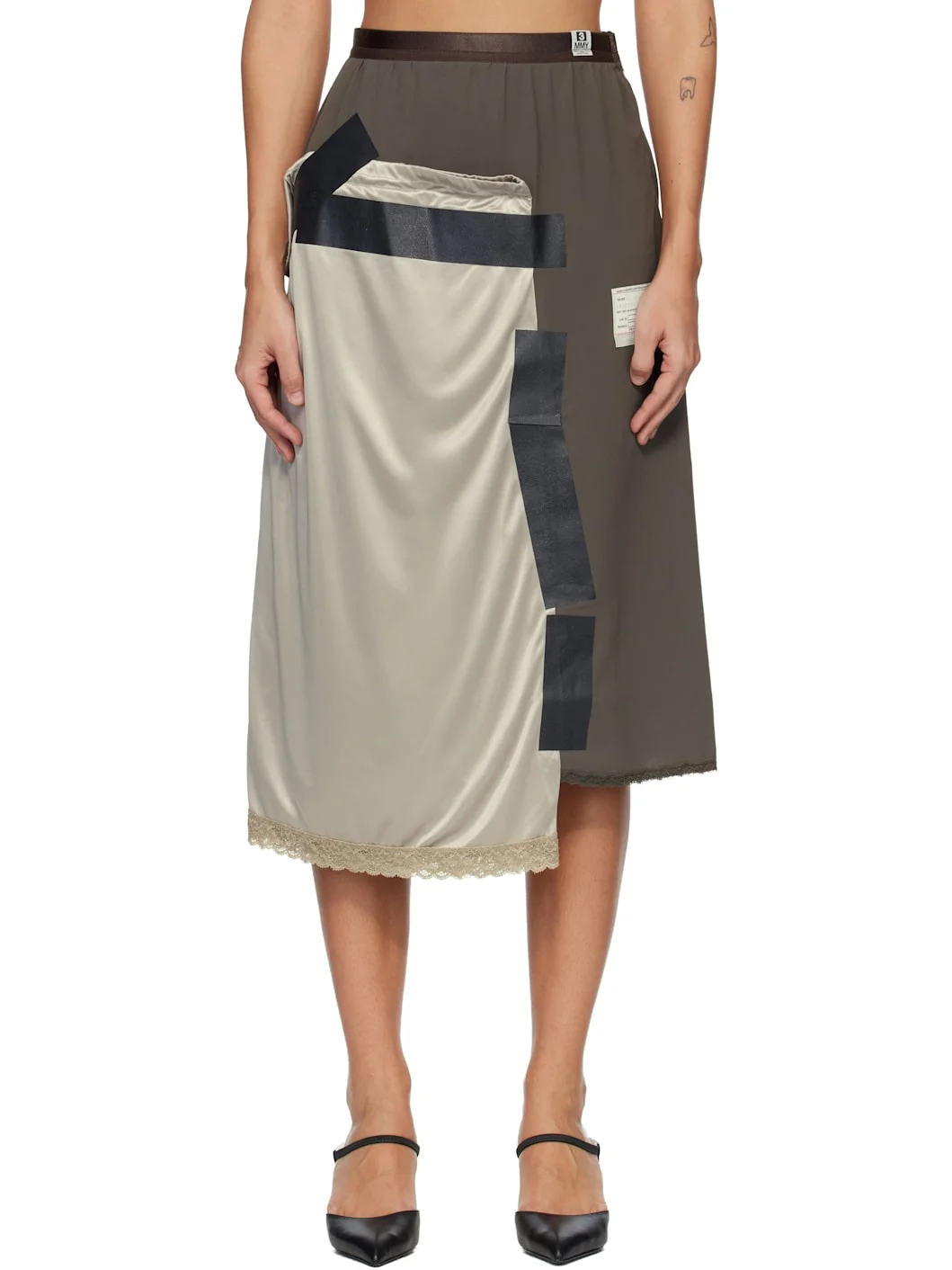 Woven polyester midi skirt · Satin waistband with logo patch at front · Logo patch at front leg · Satin panel at side with bonded appliques · Asymmetric hem with embroidered lace edge Supplier color: Brown 100% polyester. Made in Japan 261551F092003