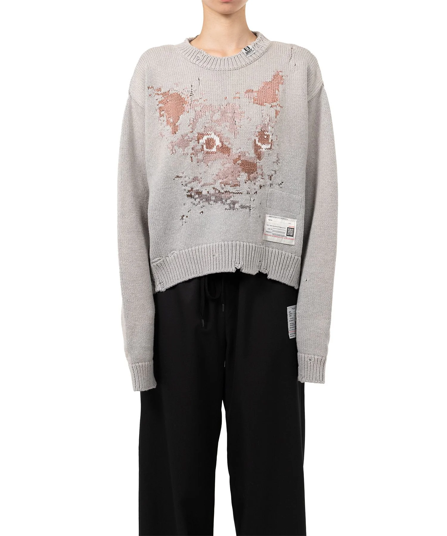 【2025 Autumn/Winter Collection】 Cat Jacquard Knit Sweater A pullover knit sweater with a large cat pattern. The hem and cuffs are designed to look as if the knit has frayed. Crew neck. The entire garment has been distressed. *Due to the distressing process, the color of the product may vary in some areas. Wearing model : 175cm Wearing size : 38 ※Product images may appear different from the actual item due to lighting conditions during photography or variations in monitor settings. ※Some photos feature sample items; actual products may differ slightly in finish or sizing. ※Color, texture, and specifications may vary slightly due to differences in production timing or individual characteristics of each piece. We appreciate your understanding. ※Intentional distressing such as holes, fading, and staining is part of the design and reflects the character of the item. Please enjoy these features as part of its unique aesthetic. - Item No: B15SW521 - Brand: Maison MIHARA YASUHIRO - Category: WOMENS » TOPS » KNIT - Season: 2025 A/W - Material: COTTON 70% WOOL 29% ACRYLIC 1% - Made In: CHINA