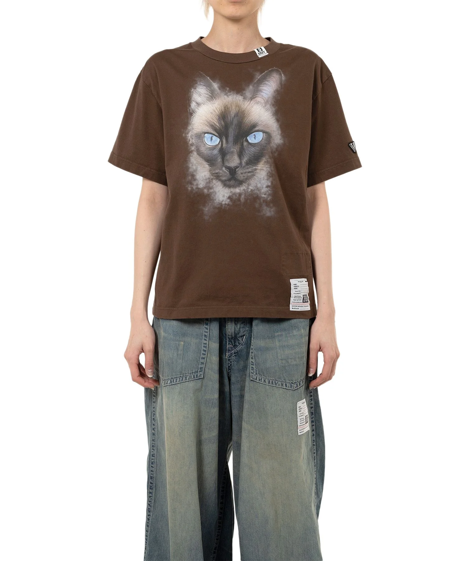 【2025 Autumn/Winter Collection】 Cat Printed T-shirt Cat T-shirt with cat printed on front. Crew neck. Original embroidered patch on the left cuff. *The cat species printed on the product differs depending on the color of the product. *Tears seen throughout are part of the design. Wearing model : 170cm Wearing size : 38 ※Product images may appear different from the actual item due to lighting conditions during photography or variations in monitor settings. ※Some photos feature sample items; actual products may differ slightly in finish or sizing. ※Color, texture, and specifications may vary slightly due to differences in production timing or individual characteristics of each piece. We appreciate your understanding. - Item No: K15TS771 - Brand: Maison MIHARA YASUHIRO - Category: WOMENS » TOPS » TSHIRTS - Season: 2025 A/W - Material: COTTON 100% - Made In: JAPAN