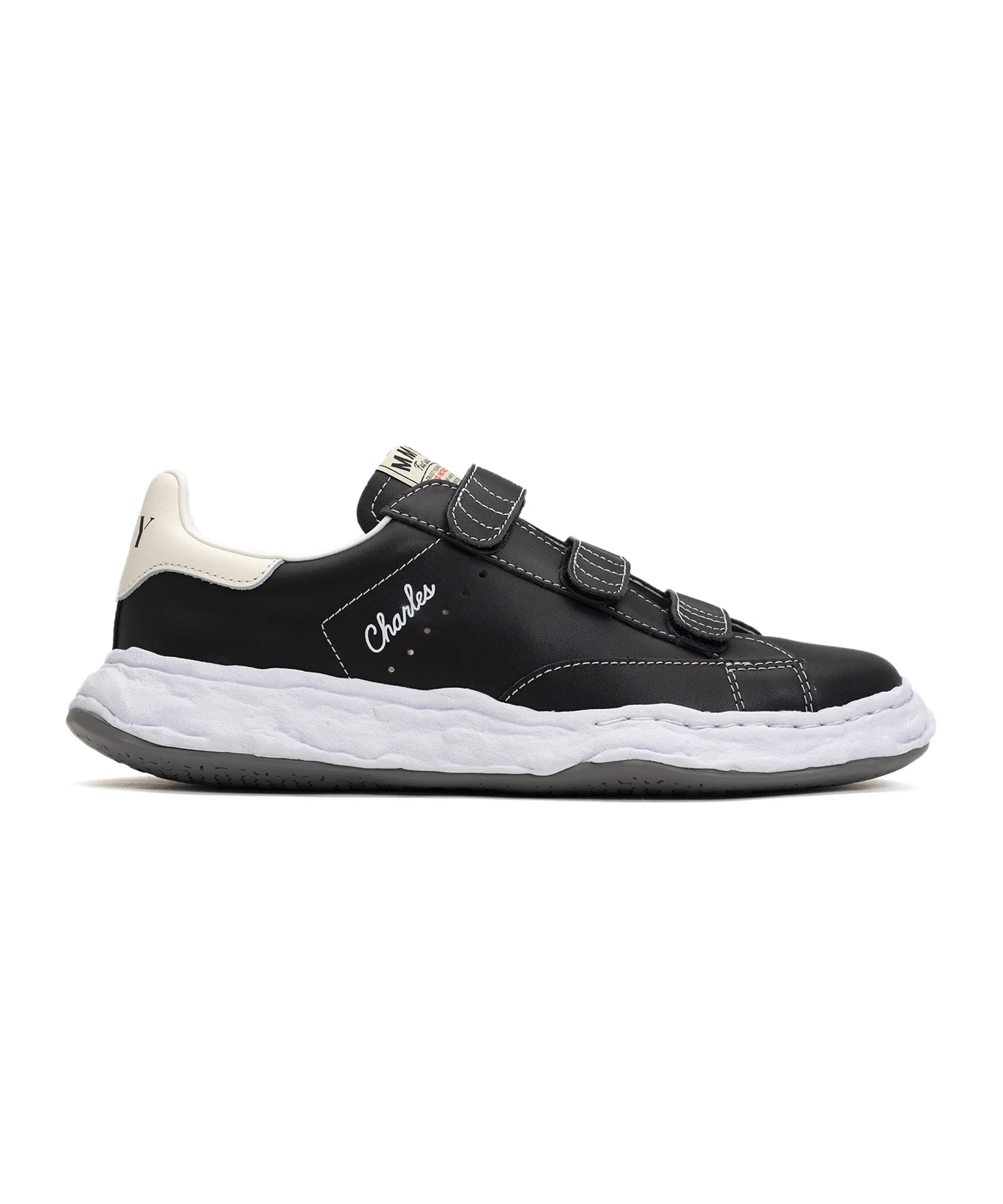 "CHARLES" Original Sole Leather Low-top Verclo Sneaker 2024SS new model "CHARLES" . Verclo design with Leather upper. Model name printed on the outer side of the upper. "MMY"designed on the counter. * Please note that the notations for 'JP' and 'US' are shown for reference purposes only. ※Product images may appear different from the actual item due to lighting conditions during photography or variations in monitor settings. ※Some photos feature sample items; actual products may differ slightly in finish or sizing. ※Color, texture, and specifications may vary slightly due to differences in production timing or individual characteristics of each piece. We appreciate your understanding. - Item No: A12FW702 - Brand: Maison MIHARA YASUHIRO - Category: EVERYONE » SHOES » SNEAKERS - Material: UPPER : COW LEATHER SOLE : RUBBER - Made In: CHINA