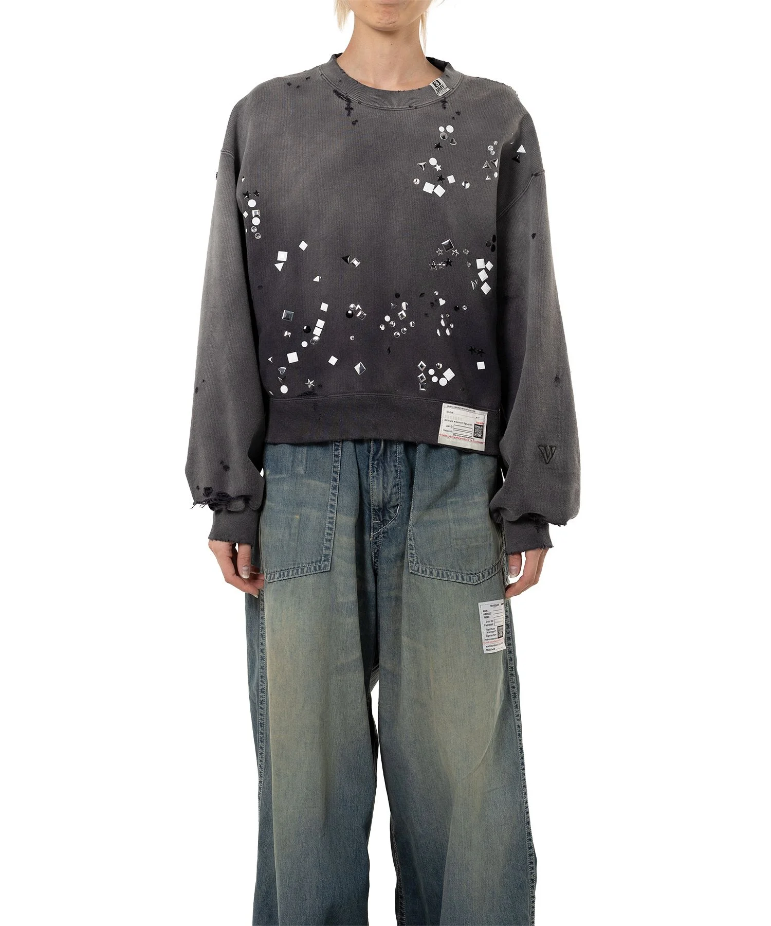 【2025 Autumn/Winter Collection】 Sun Faded Like Embellished Sweatshirt Sweatshirt with rhinestone embellishment. Bleached and damaged fabric looks as if it has been tanned with age. Crew neck. Short length. Original embroidered patch on the left cuff. Wearing model : 170cm Wearing size : 38 ※Product images may appear different from the actual item due to lighting conditions during photography or variations in monitor settings. ※Some photos feature sample items; actual products may differ slightly in finish or sizing. ※Color, texture, and specifications may vary slightly due to differences in production timing or individual characteristics of each piece. We appreciate your understanding. ※Intentional distressing such as holes, fading, and staining is part of the design and reflects the character of the item. Please enjoy these features as part of its unique aesthetic. ※Stability when wearing may vary depending on the individual. Please use with caution depending on the walking environment. - Item No: B15PO553 - Brand: Maison MIHARA YASUHIRO - Category: WOMENS » TOPS » SWEATSHIRTS - Season: 2025 A/W - Material: COTTON 100% - Made In: JAPAN