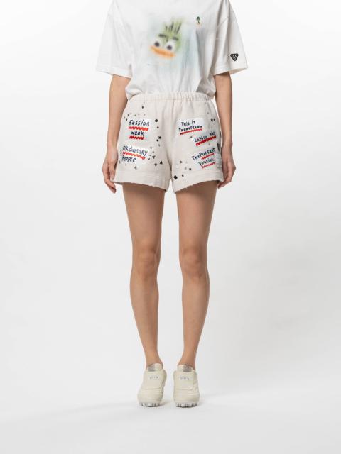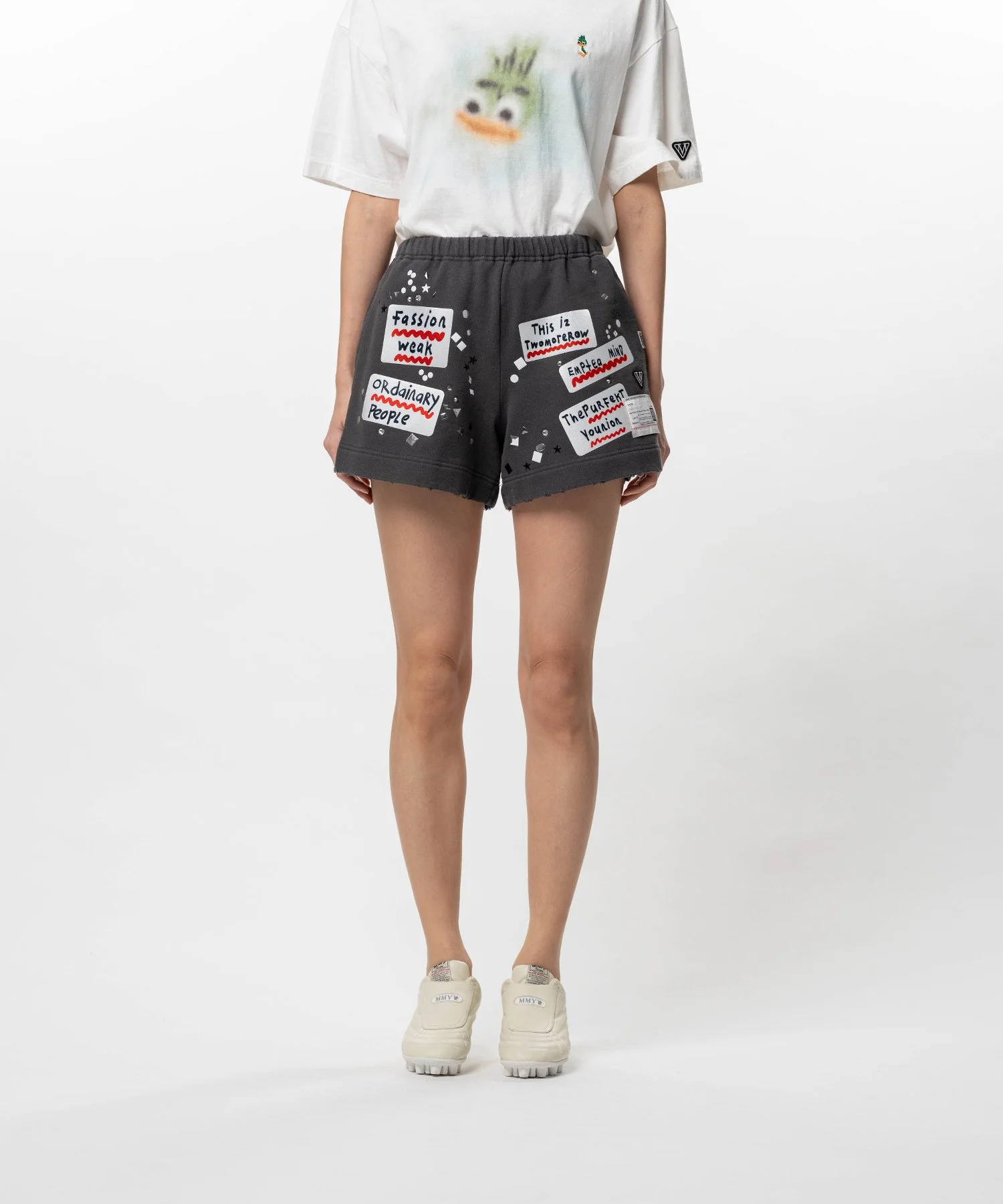 【2026 Spring /Summer Collection】 Embellished Sticker Sweat Shorts Sweat shorts featuring sticker graphics by Navinder Nangla. Each piece has unique fading and texture. Side pockets, back pocket. Elastic waistband with drawstring closure. Wearing model : 175cm Wearing size : 38 ※Product images may appear different from the actual item due to lighting conditions during photography or variations in monitor settings. ※Some photos feature sample items; actual products may differ slightly in finish or sizing. ※Color, texture, and specifications may vary slightly due to differences in production timing or individual characteristics of each piece. We appreciate your understanding. ※Intentional distressing such as holes, fading, and staining is part of the design and reflects the character of the item. Please enjoy these features as part of its unique aesthetic. - Item No: B16PT542 - Brand: Maison MIHARA YASUHIRO - Category: WOMENS » BOTTOM » PANTS - Season: 2026 S/S - Material: Cotton 100% - Made In: JAPAN