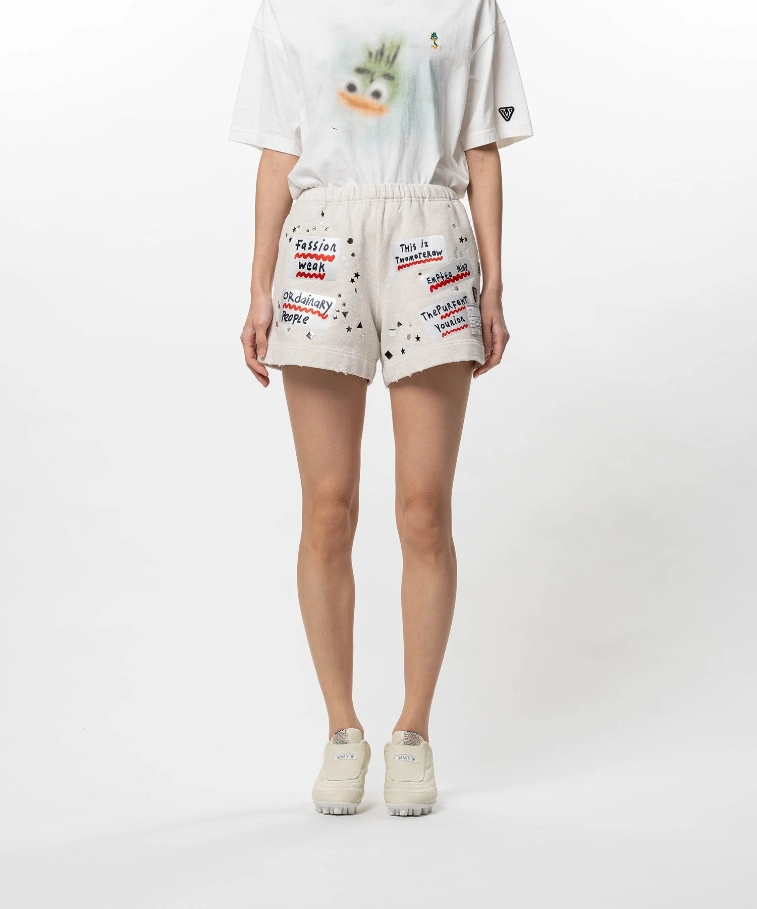 【2026 Spring /Summer Collection】 Embellished Sticker Sweat Shorts Sweat shorts featuring sticker graphics by Navinder Nangla. Each piece has unique fading and texture. Side pockets, back pocket. Elastic waistband with drawstring closure. Wearing model : 175cm Wearing size : 38 ※Product images may appear different from the actual item due to lighting conditions during photography or variations in monitor settings. ※Some photos feature sample items; actual products may differ slightly in finish or sizing. ※Color, texture, and specifications may vary slightly due to differences in production timing or individual characteristics of each piece. We appreciate your understanding. ※Intentional distressing such as holes, fading, and staining is part of the design and reflects the character of the item. Please enjoy these features as part of its unique aesthetic. - Item No: B16PT542 - Brand: Maison MIHARA YASUHIRO - Category: WOMENS » BOTTOM » PANTS - Season: 2026 S/S - Material: Cotton 100% - Made In: JAPAN