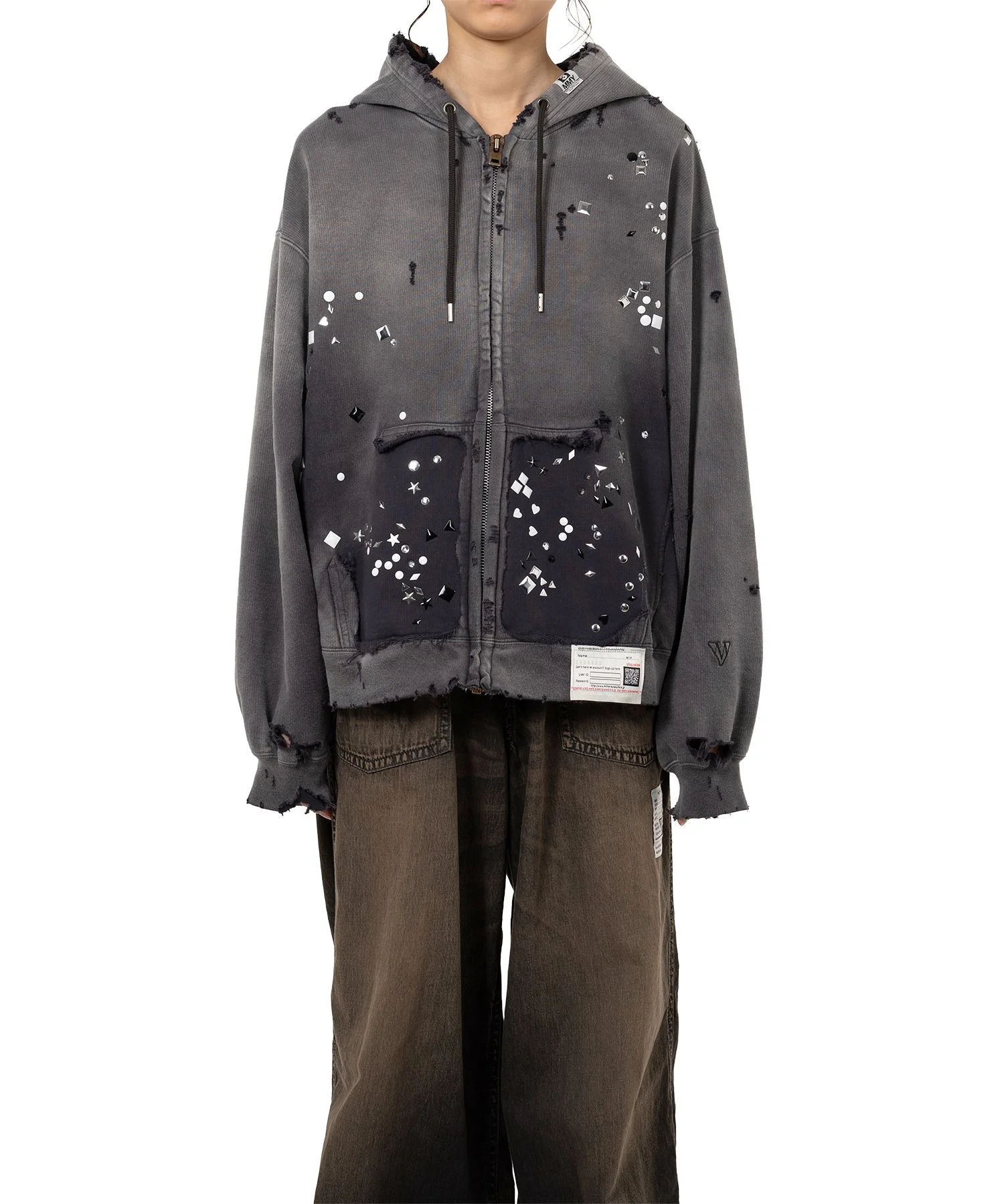 【2025 Autumn/Winter Collection】 Sun Faded Like Embellished Zip-up Hoodie Zip-up hoodie with rhinestone embellishments. The fabric is bleached and damaged to make it look as if it has been tanned with age. Front pockets are designed with a torn-out design. Original embroidered patch on left cuff. *Hole damage seen throughout is part of the design. Wearing model : 175cm Wearing size : 38 ※Product images may appear different from the actual item due to lighting conditions during photography or variations in monitor settings. ※Some photos feature sample items; actual products may differ slightly in finish or sizing. ※Color, texture, and specifications may vary slightly due to differences in production timing or individual characteristics of each piece. We appreciate your understanding. ※Intentional distressing such as holes, fading, and staining is part of the design and reflects the character of the item. Please enjoy these features as part of its unique aesthetic. ※Stability when wearing may vary depending on the individual. Please use with caution depending on the walking environment. - Item No: B15PK551 - Brand: Maison MIHARA YASUHIRO - Category: WOMENS » TOPS » SWEATSHIRTS - Season: 2025 A/W - Material: COTTON 100% - Made In: JAPAN