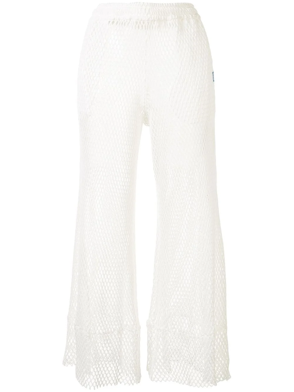flared mesh trousers White cotton blend flared mesh trousers from Maison MIHARA YASUHIRO featuring an elasticated waistband, side pockets, a sheer construction and a cropped length. Imported Composition Polyester 100% Body: Cotton 100% SIZE & FIT Model measurements Height 5 ft 10 in(1.78 m) Bust/Chest 31.49 in(80 cm) Hips 34.64 in(88 cm) Waist 23.62 in(60 cm) FittingInformation This piece fits true to size. We recommend you get your regular size Cut for a loose fit Made with a mid-weight fabric Washing instructions Hand Wash