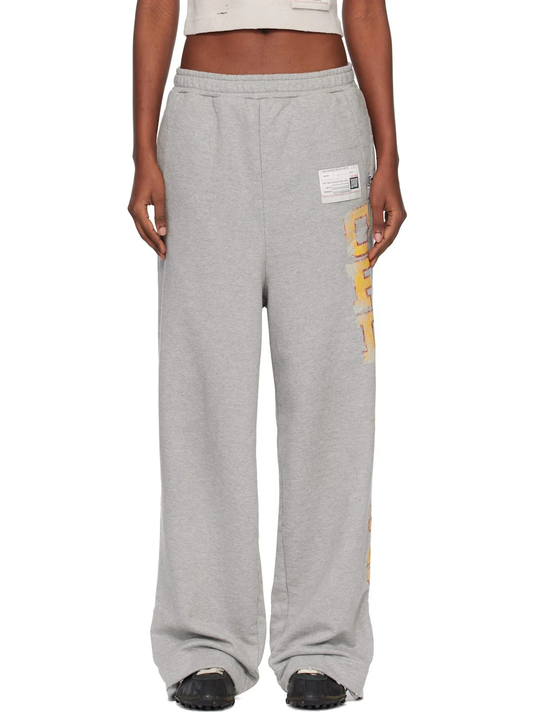 French terry sweatpants. · Subtle distressing throughout · Concealed drawstring at elasticized waistband · Three-pocket styling · Logo patches at front · Pleat at cuffs · Text printed at outseam Supplier color: Gray 100% cotton. Made in Japan 261551F086000