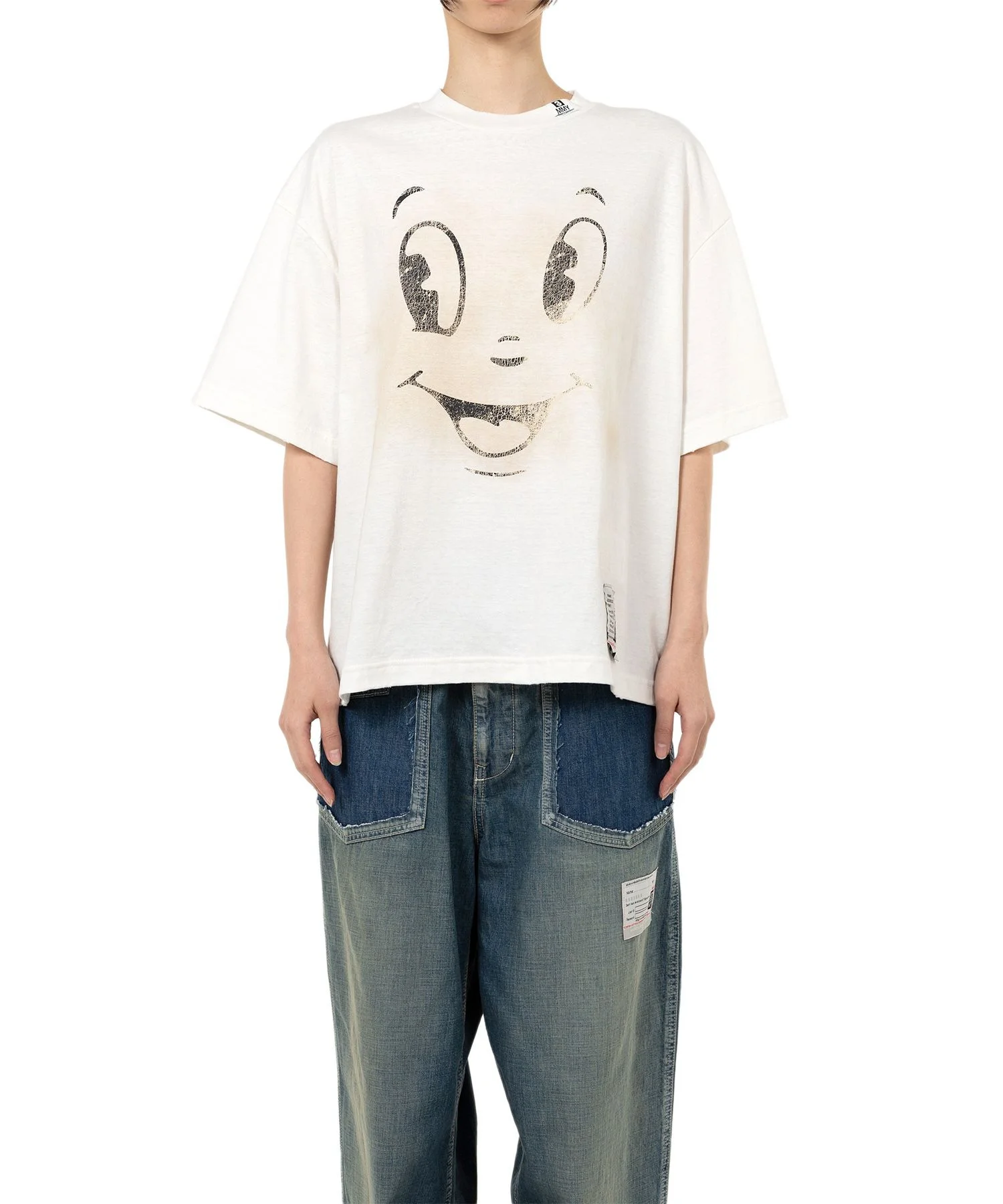 【2025 Autumn/Winter Collection】 Happy Face Printed Distressed T-shirt T-shirt with happy face printed on front. Crew neck. *Stains found throughout are part of the design. Wearing model : 175cm Wearing size : 38 ※Product images may appear different from the actual item due to lighting conditions during photography or variations in monitor settings. ※Some photos feature sample items; actual products may differ slightly in finish or sizing. ※Color, texture, and specifications may vary slightly due to differences in production timing or individual characteristics of each piece. We appreciate your understanding. - Item No: K15TS761 - Brand: Maison MIHARA YASUHIRO - Category: WOMENS » TOPS » TSHIRTS - Season: 2025 A/W - Material: COTTON 100% - Made In: JAPAN