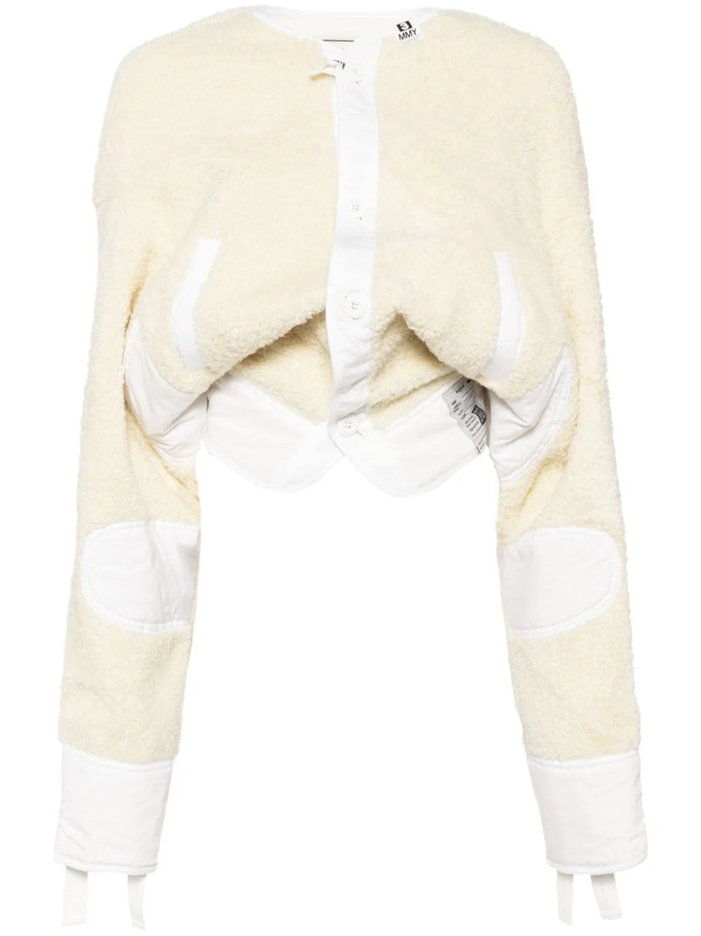 long-sleeve cropped jacket Highlights - White - Round neck - Two side pouch pockets - Long sleeves - Front button fastening - Panel detailing - Cropped - Asymmetric hem Imported Composition Base: Acrylic 55%, Polyester 45% Coating: Acrylic 100% Lining: Polyester 100% Trims: Cotton 100% SIZE & FIT Model measurements Height 5 ft 9 in(1.76 m) Bust/Chest 31.1 in(79 cm) Hips 35.03 in(89 cm) Waist 24.4 in(62 cm) FittingInformation Designed for an oversized fit, offering additional room throughout Constructed with additional length on the sleeve Made from a midweight non-stretch fabric