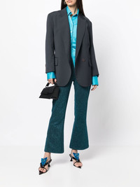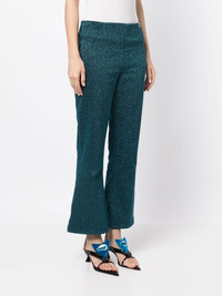 metallic flared trousers turquoise blue-green cotton blend metallic threading mid-rise logo patch to the rear flared Imported Composition Cotton 91%, Polyester 7%, Polyurethane 2% SIZE & FIT Model measurements Height 5 ft 10 in(1.78 m) Bust/Chest 33.07 in(84 cm) Hips 33.85 in(86 cm) Waist 25.19 in(64 cm) FittingInformation This piece fits true to size. We recommend you get your regular size Designed to be fitted at the waist and through the thigh, loose from the knee Made with a mid-weight stretch fabric Washing instructions Hand Wash